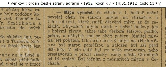 Třetí díl Hlasy mých otců (1987) líčí období od r. 1848, kdy se stružinecký mlynář Josef Šmahel stal mlynářem v Chrudimi v dřevěném mlýně Hrkačka. Stál pod Slepičími schody, v místech, kde se od náhonu, dodnes existujícího, odděloval vedlejší náhon, jehož voda poháněla mlýn. Vedlejší náhon, mnohem později zrušený, vedl středem Koželužské ulice, kde na počátku 20. stol. dal ovdovělé mlynářce její druhý manžel postavit dům. Odtud pozorovala v roce 1912 požár, který dřevěnou Hrkačku úplně zničil.
