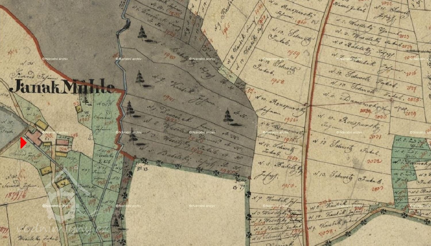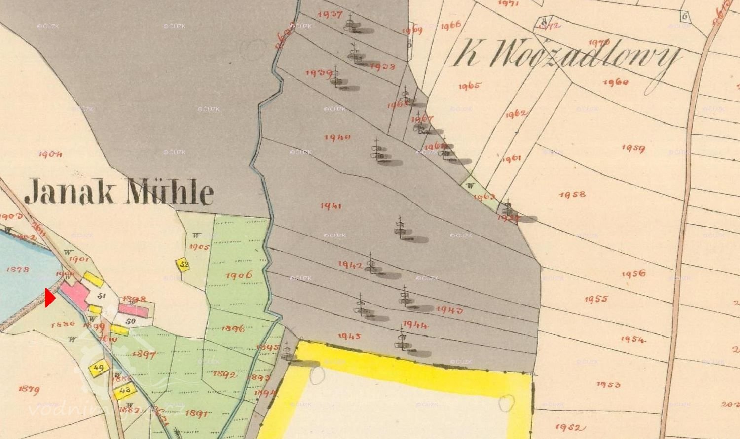 V protokolu výměru z 16.10.1940 sepsaného na základě žádosti Františka Křivánka o vodoprávním zjištění a schválení vodního díla je uvedeno, že voda přitékající potokem byla zadržována v rybníce - akumulační nádržce pro mlýn. V levé straně hráze byla dřevěná roura dlouhá 3,6 m a průřezu 28x22 cm uzavíratelná ze strany návodní stavítkem. Roura přecházela ve žlab vedoucí vodu k mlýnskému kolu.