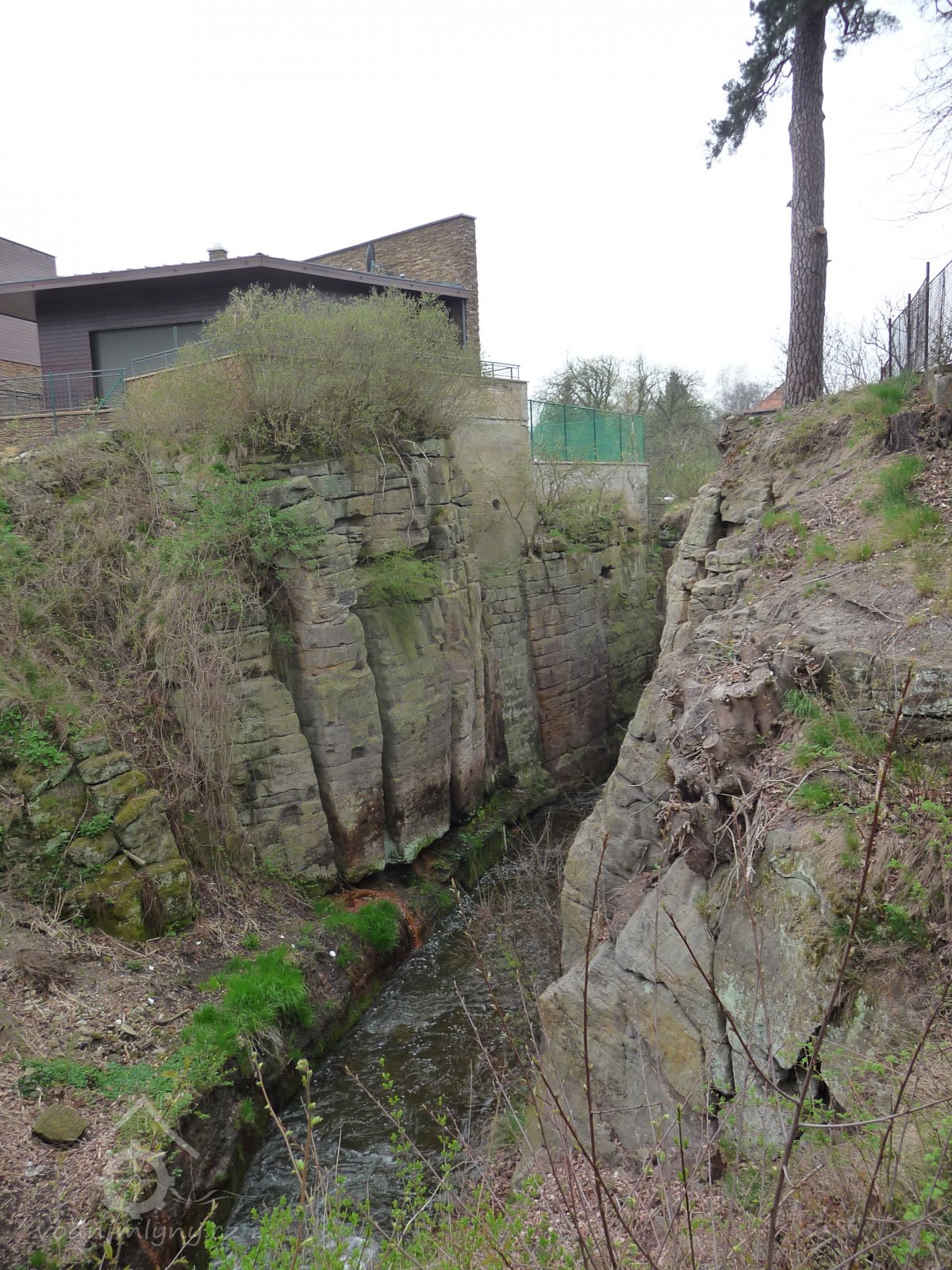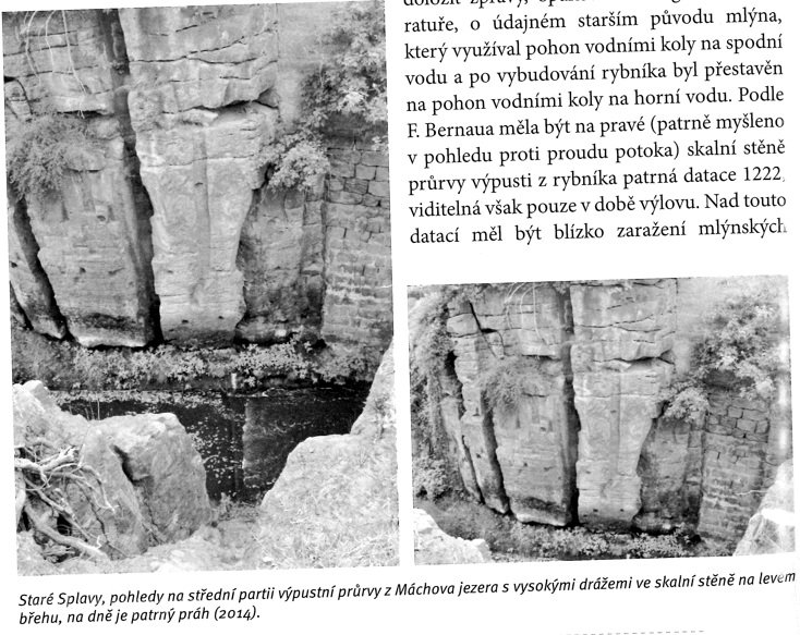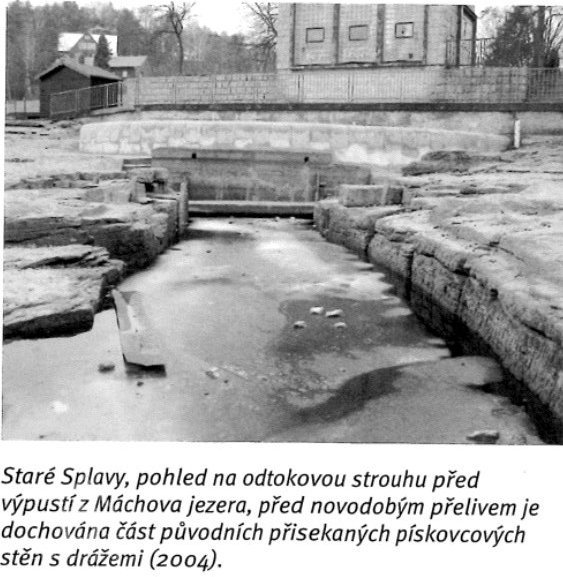 Směrem k přelivu vede šikmo odpadní strouha s pečlivě přisekanými stěnami, do kterých jsou vyhloubeny svislé dráže pro osazení hradicích zařízení a česel, vyskytují se zde i neobvyklé kruhové prohlubně. Pod přelivem spadá voda do hluboké skalní průrvy vysekané rovněž do pískovcového podloží. Na jejím počátku je široké vývařiště, za ním se průrva zužuje a objevují se pečlivě přisekané stěny, v nich jsou vyhloubeny většinou naproti sobě na obou březích svislé dráže o výšce 5 - 10 m, některé mají na dolním konci zakřivený průběh, umožňující plynulé nasazení trámů. Další mají typickou sestavu svislé hluboké dráže pro umístění rámu mohutné stavidlové konstrukce, doplněné o kapsy pro zapažení stavidel vodorovnými trámy a případným šikmým pažením. Mimo to se zde nalézají také jednoduché kapsy po trámech.