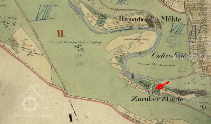 Roku 1743 dle urbáře dostával Josef Záruba (syn Jana Záruby, oddán dne 25. prosince 1732 s Terezií dcerou zesnulého Ondřeje Hájka.), jako obecní mlynář čtvrt vědra piva z každé várky. V roce 1750 se již Záruba uvádí jako majitel mlýna a po něm mlýnu jméno zůstalo. Mlýn měl jedno složení. Na mlýně byli mezi mlynářskými pomocníky Procházka a Valenta, což svědčí o provázanosti mlynářských rodin.