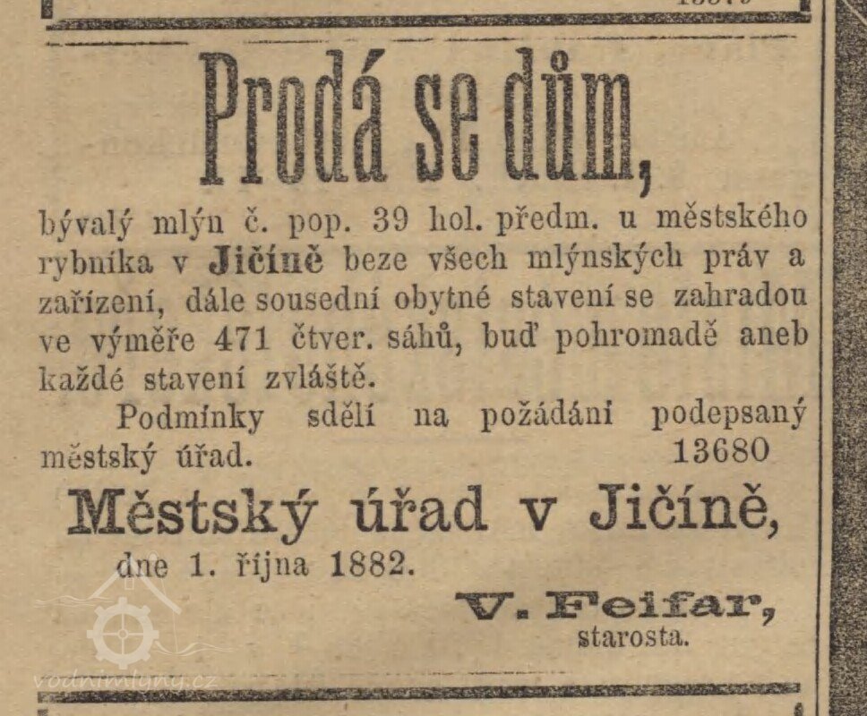 Vroce 1760 prodala obec mlýn takzvaný podvodárský Františku Javůrkovi, ten se však špatně porovnal. proto již v roce 1762 obec prodala mlýn Janu Samohrdovi; ne nadlouho; po roce 1770 Janu Saalovi;Roku 1770 platil ročně mlynář Jan Saal 130 zlatých a za službu při vodárně městské a za bukové a habrové dřevo, kterým v zimě vodárnu vytápěl dostal 15 zlatých a 30 krejcarů.  1791 koupili mlýn od vdovy Kateřiny Saalové a sirotků manželé František a Viktorie Šefelinovi, v roc1794 Václav a Rosálie Riegrovi, 1798 Matěj Půhonný, 1799 Josef a Kateřina Machačkovi; roku 1816 dědil mlýn Václav Machačka. Roku 1846 koupil mlýn,zahradu pole a luka Adolf Laurich z Jablonce, přistavěl k mlýnu vysoký komín a na pohon koupil parní stroj (první v Jičíně). Mlýn vyhořel toho roku a přešel na Jana Schmidta, pak na Jana Neuberta.