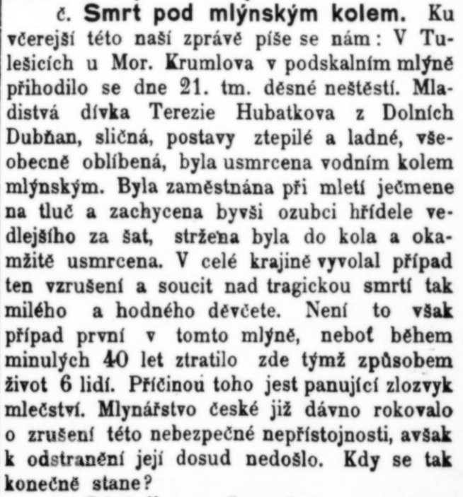 R. 1903 zde byla usmrcena vodním kolem dívka. Během 40 let předtím zde zahynulo podobným způsobem šest lidí. (RR)