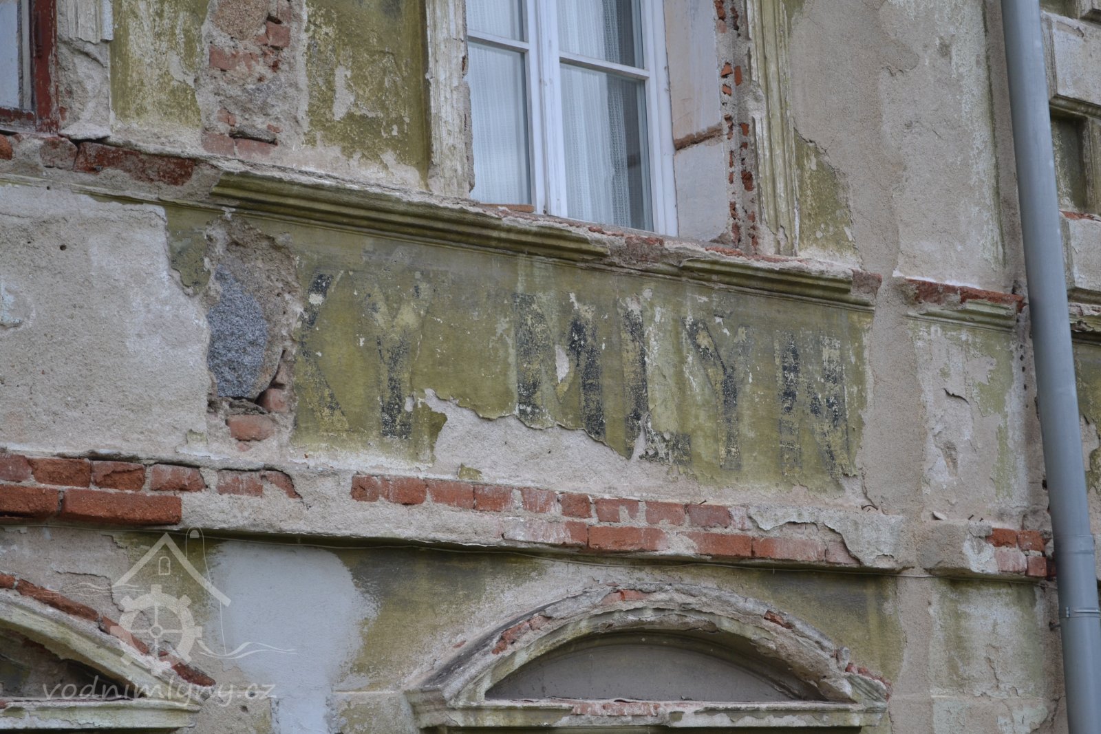 Pozůstatky nápisu na fasádě mlýna, 16.11.2014, © Racocha, (Prvky na obrázku: epigrafické památky (nápisy, datování aj.))
