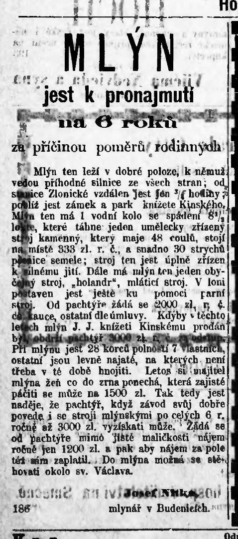 1873 Josef Nitka, mlýn nabízen k pronájmu