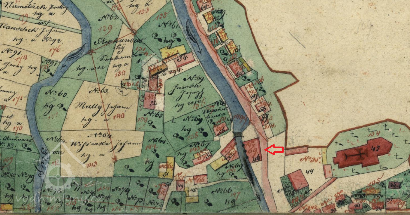V roce 1826 mlýn vlastní Josef Jarošek, mlýn má čp. 69, na mapě jsou znázorněna tři kola, tj. mlýn měl zřejmě tři složení.