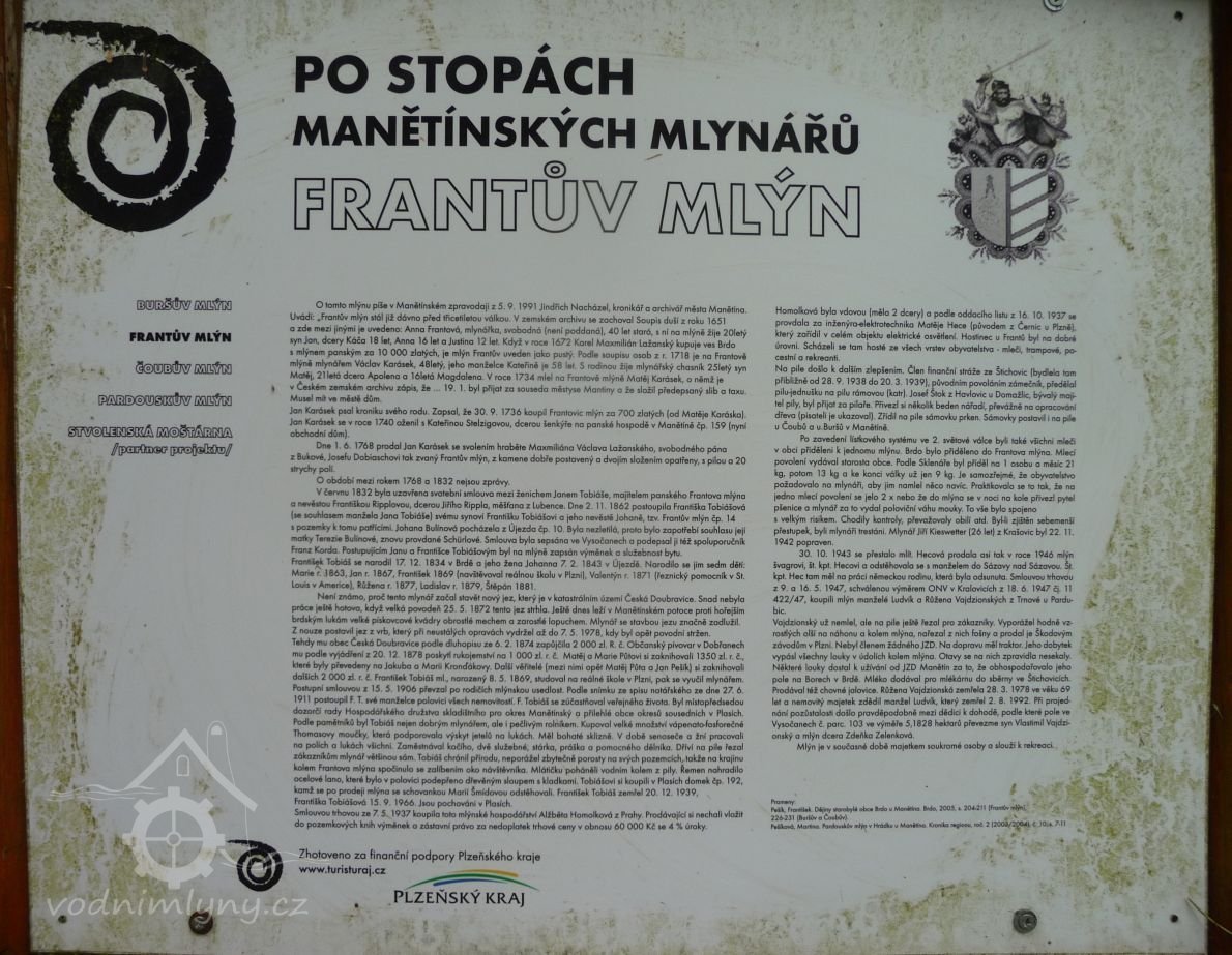 Areál Frantova mlýna leží na soutoku Lučního a Manětínského potoka, na odlehlém místě mezi Manětínem a Brdem. Poprvé je mlýn zmiňován roku 1672, kdy je po třicetileté válce uváděn jako pustý. V 18. století byla k mlýnu přistavěna obytná místnost v patře, kůlna, stáje, zřízena byla i nová větší pila a zeď kolem zahrady. V roce 1757 byla vybudována zcela nová mlýnská strouha. V roce 1872 měl mlýn dvě složení a jednu pilu. Během 2. světové války byl mlýn v nečinnosti, na pile se však řezalo ještě po roce 1945.