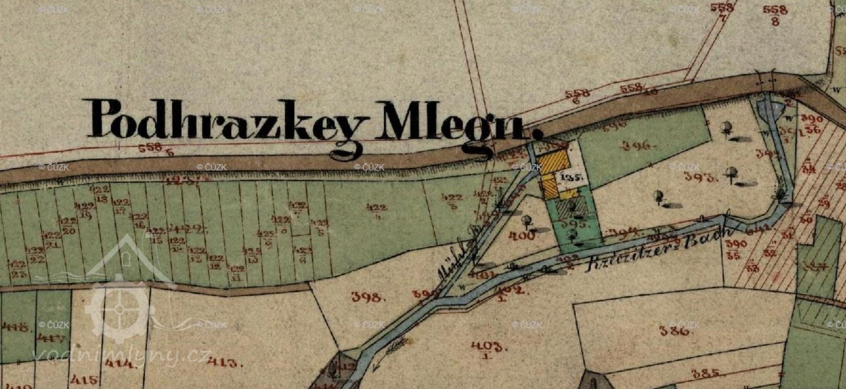Podhrázský mlýn na potoce Heřmanka stál původně u hráze rybníka, který dal v roce v roce 1852 Alfons Gabriel hrabě Aichelburg vypustit a v úrodné půdě začal pěstovat cukrovou řepu. Mlýn prodal Josefu Kotykovi, který jej po požáru v roce 1873 obnovil jako zděný s „americkým“ složením, snad první v Čechách. Roku 1900 mlýn převzal po otci Jan Kotyk, který během první světové války vypomáhal občanům Bělohradu moukou a je po něm proto pojmenována ulice při mlýně. Jeho syn Josef Kotyk mlýn rekonstruoval, ke stávající dvoupatrové mlýnici roku 1932 přistavěl patrovou budovu s dalšími třemi páry válců, jako záložní zakoupil naftový motor. Provoz ve mlýně skončil na začátku padesátých let, v současné době objekt patří Střednímu odbornému učilišti, které jej adaptovalo pro své potřeby.