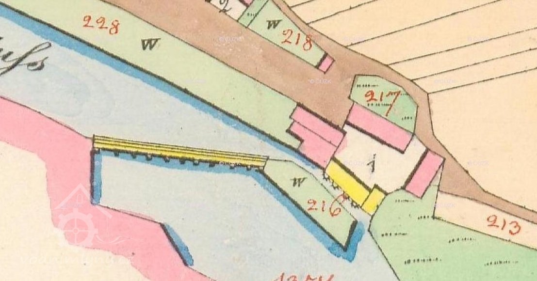 Popis1930 - 2 kola na spodní vodu, průtok vody 924 l/s a 446 l/s, spád 2 m a 2 m, výkon 9,2 a 3,8 HP