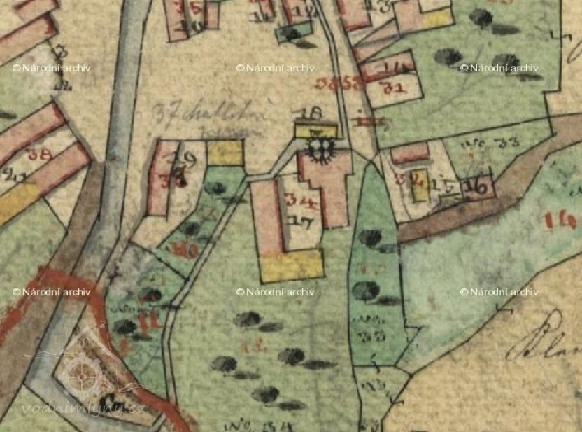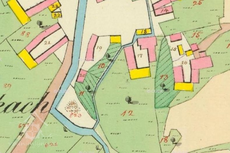 1930 - Václav Ouřada, mlyn. družstvo, mlýn a pila, 2 kola na svrchní vodu, průtok 190 l/s, spád vody 3 m.
