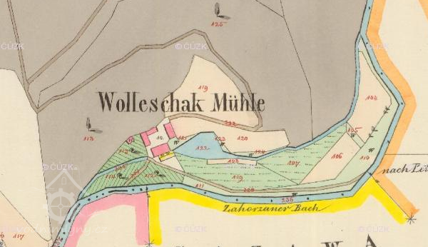 Náhon ze Záhořanského potoka původně veden nejprve do rybníka a teprve odtud na kolo.