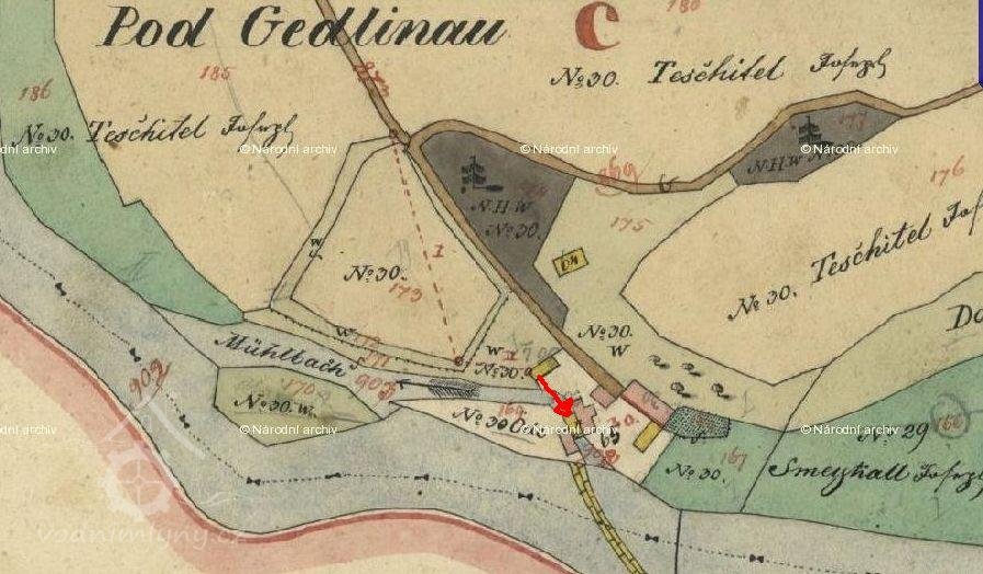 Na indikační skice a císařském otisku z r. 1838 je vidět, že mlýn byl z nespalného materiálu, o dvou kolech, na náhonu z řeky Sázavy. Měl čp. 30 a p.č.st.65. Mlynářem a majitelem mlýna byl v r. 1838 Josef Těšitel.