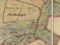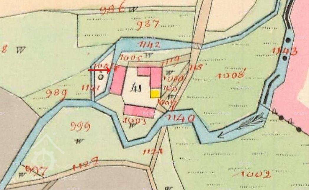 Na císařském otisku a indikační skice z roku 1838 má mlýn čp. 23 a je na p.č.st. 41. Objekt byl v té době z nespalného materiálu, mlýn stál na náhonu ze Zbožského potoka, mezi mlýnem Vlčkovým čp.21 a mlýnem Kučerovým čp.25 v kunemilském katastru. Majitelem byl v r. 1838 Jan Bradáč.