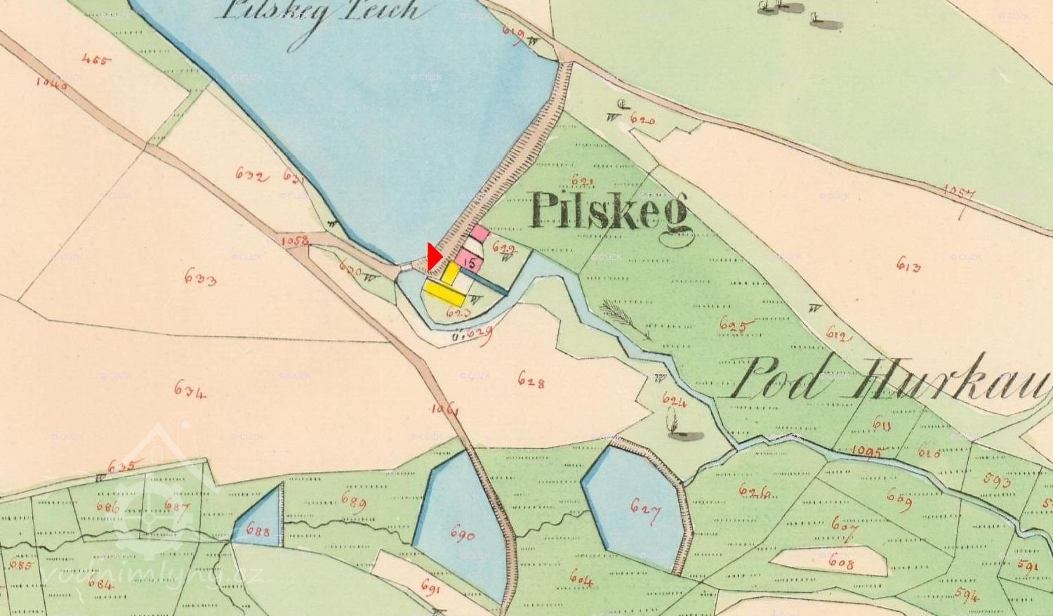 3. zápis: Výměr z 25.9.1933 – voda se přivádí z Pilského rybníka rourou o průřezu 42x43 cm do dřevěné kašny o rozměru 275x165x110 cm a přes vantroky na dvě vodní kola o totožném rozměru průměr 4 m a šířka 1 m k pohonu pily a zemědělské mlátičky.