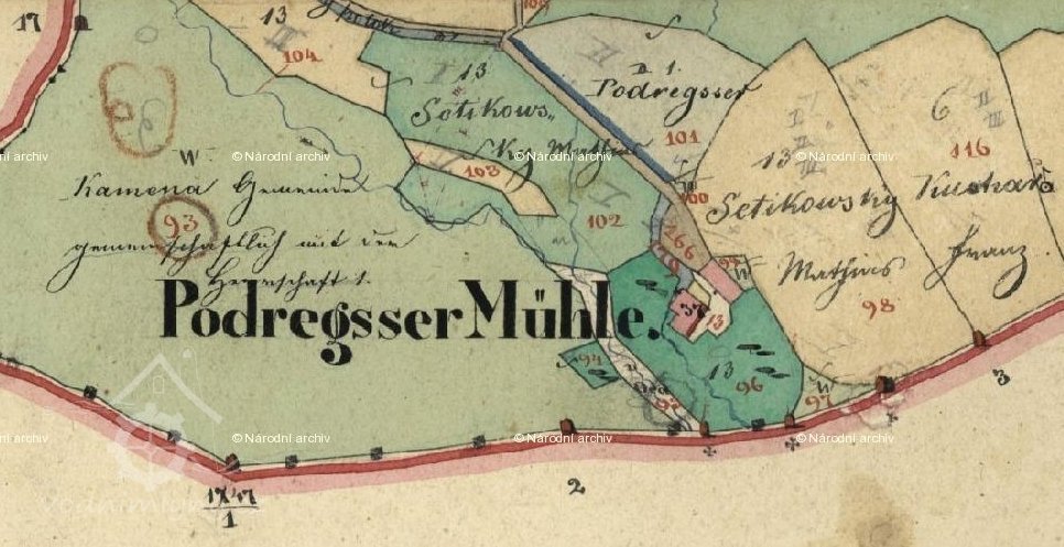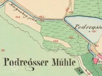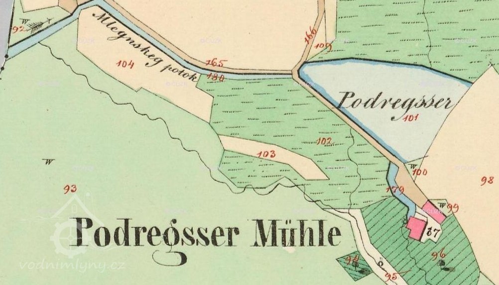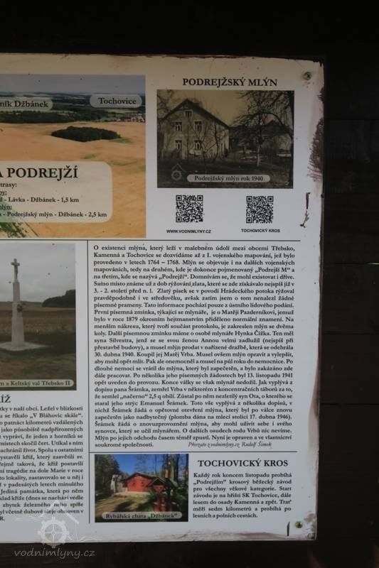 O existenci mlýna, který leží v malebném údolí mezi obcemi Třebsko, Kamenná a Tochovice se dozvídáme až z I. vojenského mapování, jež bylo provedeno v letech 1764 – 1768. Mlýn se objevuje i na dalších vojenských mapováních, tedy na druhém, kde je dokonce pojmenovaný „Podrejší M“. a na třetím - tady se nazývá „Podrejží“. Domnívám se, že mohl existovat i dříve. Samo místo známe už z dob rýžování zlata, které se zde získávalo nejspíš již v 3. - 2. století před n. l. Zlatý písek se v povodí Hrádeckého potoka rýžoval pravděpodobně i ve středověku, avšak pouze podle ústního lidového podání, zatím jsem o tom nenalezl žádné písemné prameny. První písemná zmínka je o Matěji Pazderníkovi, jemuž bylo v roce 1879 okresním hejtmanstvím přiděleno normální znamení. Na menším nákresu, který tvoří součást protokolu, je zakreslen mlýn se dvěma koly. Další písemnou zmínku máme o osobě mlynáře Hynka Čížka. Ten měl syna Silvestra, jenž se se svou ženou Annou velmi zadlužil (nejspíš při přestavbě budovy) a musel mlýn prodat v nařízené dražbě, která se odehrála 30. dubna 1940. Koupil jej Matěj Vrba. Musel ovšem mlýn opravit a vylepšit, aby mohl opět mlít. Pak ale onemocněl a musel na půl roku do nemocnice. Po dlouhé nemoci se vrátil do mlýna, který byl zapečetěn a bylo zakázáno zde dále pracovat. Po několika jeho písemných žádostech byl 13. listopadu 1941 opět uveden do provozu. Konce války se však mlynář nedožil. Jak vyplývá z dopisu pana Šrámka, zemřel Vrba v některém z koncentračních táborů za to, že semlel „načerno“ 2,5 q obilí. Zůstal po něm nezletilý syn Ota, o kterého se jeho strýc Emanuel Šrámek staral. Toto vše vyplývá z několika dopisů, v nichž Šrámek žádá opětovné otevření mlýna, který byl po válce znovu zapečetěn jako nadbytečný (Plomba dána na mlecí stolici. 17. dubna 1946). Šrámek žádá o znovuzprovoznění mlýna, aby mohl uživit sebe i svého synovce, který se učil mlynářem. O dalších osudech rodu Vrbů nic nevíme. Mlýn po jejich odchodu časem téměř zpustl. Jméno dnešního vlastníka se zatím nepodařilo zjistit. Budova v nedávné době byla zcela opravena a adaptována.