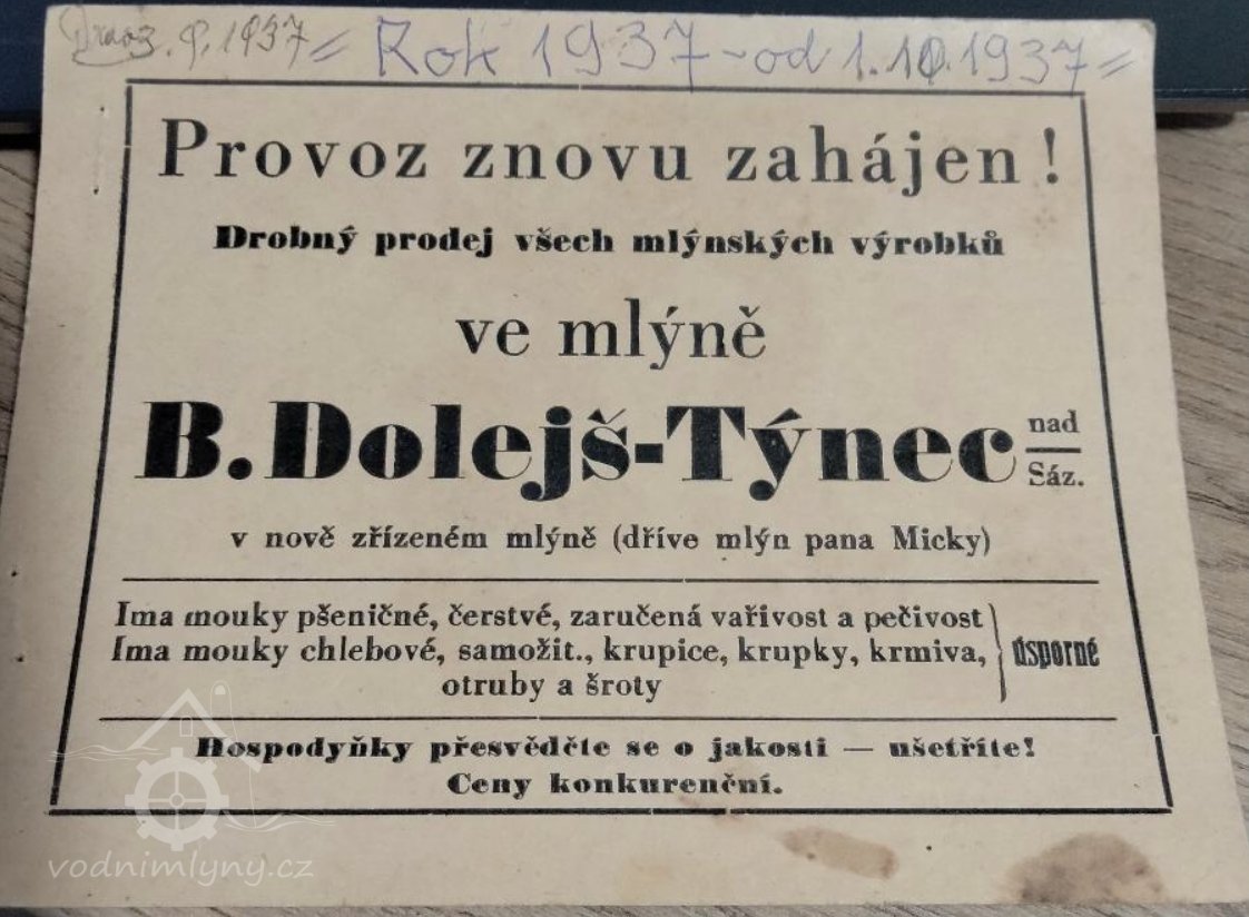 1. listopadu 1937 mlýn po opravě strojů opět spuštěn, nainstalována zde Francisova turbína o výkonu 65 HP.