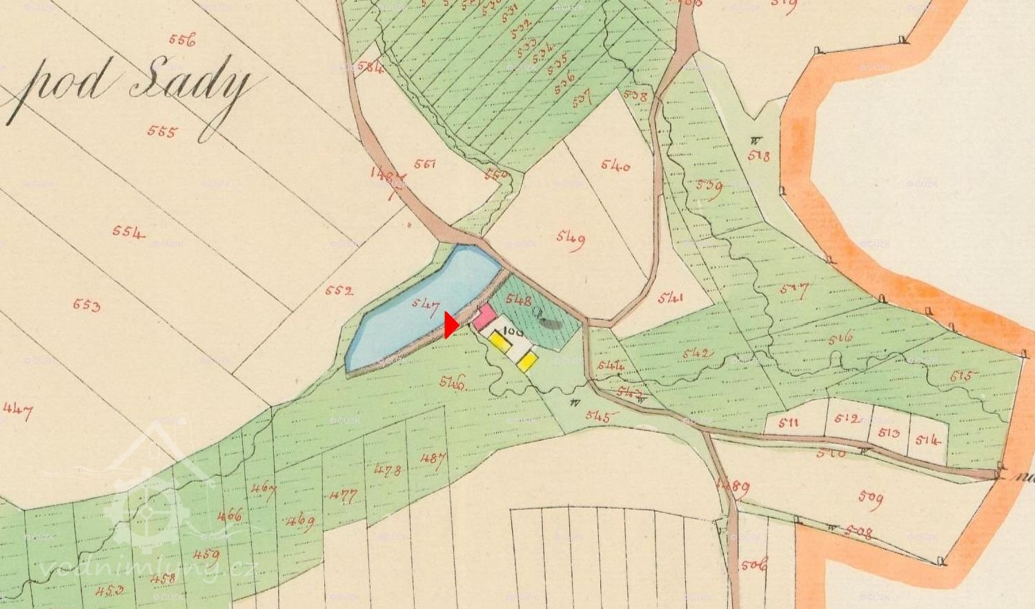1.zápis – živnost mlynářská; normální znamení zasazeno r.1879 – železná kramle na mlýně u dveří do mlýnice. Voda se vede z rybníka dřevěnou rourou průměr 21 cm. Vodní kolo průměr/šířka 4,9/063 m žene jedno složení a 2 stoupy.
