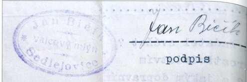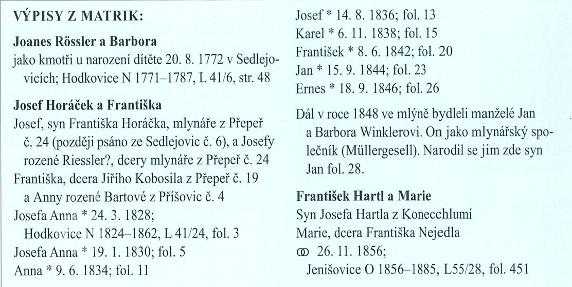 Já, Jakub Ignatius Lamotte z Frintroppu, pán na Albrechticích, Sychrově, Kamenici a svobodném dvoře v Příšovicích, známo činím tímto listem vůbec, předebvším kde čten nebo čtoucí slyšán bude, zvláště tu, kdež potřeba toho ukazovat bude, že jsem prodal mlejn pod dvoje složení s pilou a stoupou ve vsi Sedlejovicích ležící, se všemi případnostmi k němu od starodávna přináležejícími ppříslušenství loukou, kus rolí, tak jak mezníky obnmezováno jest, Václavu Reslerovi, mlynáři, poddanému mému., též dědicům a bvudoucím potomkům jeho, podle prošacování práva konšelského a řemesla mlynářského za sumu 460 zl., každý po 60 krejcarech a každý krejcar po ž penězích počítaje. Kteroužto sumu odn následovně odvozovat a platit bude. Hned při datu tohoto listu neb při smlouvě té závdavku složí 100 zl. rejnských, potom při sv. Janě 100 zl., v roce pořád sběhlým 50 zl. a pak až do vyplacení sumy ročně po 25 zl. dokládati bude. Václav Resler, též potomci jeho neb kterýkoliv držitel téhož mlejna povinni budou mě a dědicům potomním mejm a toho mlejna a pily platiti ouroku ročního dědičného 60 zl., vždy při sv. Janu Křtiteli, vždy polouletně po třiceti zlatých platiti, a kdyby kdykoliv toho ouroku v polou letě nedali a jej zadrželi, tedy já a budoucí potomci moji tento mlejn a grunt budou se moci uvázat a jej dotud a tak dlouho držeti a užívati, dokud by mě neb budoucím potomkům mým ten plat a ourok dáván nebyl a tomu všemu že by se zadosti nestalo. Též Václav Resler a budoucí držitelé toho mlejna povinni budou jak mě, tak budoucím potomkům mým, též čeledi moji a potomků mých, též všem jiným lidem spravedlivě a věrně dělati, měřici nikolib nepřebírati, mouku pak dle slušnosti a možnosti pěknou dělati a zouplna odvozovati, totiž po jednom každým konci čistého obilí věrtel mouky a jeden věrtel otrub odvésti. Co se dotýče mletí sladův na pivovar panský, též šrotu na vinopal, z takového mlynáři žádné měřice bráti nemá, dostávaje od toho při každé várce piva soudek řediny. Dotýkaje se pak řezání klád panských, takové mlynář přede všemi jinými řezati má a povinen bude, též prkna zcela a zouplna s krajinami odváděti. Od kterého řezání pd každé jedné kopy jak prken, fošen, též taky latí z důchodu mého po třiceti krejcařích platu vycházeti má. Jestliže by pak nad dotčený mlynář Václav Resler lidem u něho meloucím spravedlivě nedělal, buďto přebíráním měřice neb odváděním málo mouky neb nenáležitým mletím, on pak jsouce napomenut takového přestat by nechtěl, teda mlejn jinému mlynáři, který by lidem spravedlivě dělati chtěl, mlynář dle yčiněné smlouvy postoupit povinen bude. Kdyby pak někdy budoucí mlynář dřevo borové na hřídel, též taky na vantroky potřeboval, takové jemu z lesů panských, jestliže by se vynajíti mohlo, proti slušnému zaplacenmí dopřáno býti má. Co se pak dotýče kamení mlýnského, když by potřeba ukazovala, takové poddaní jemu přivézti povinni budou. Též na vyklizení strouhy patnácte nádeníkůvna jeden den jemu dány býti mají. Co pak obce se dotýčr, co jemu od konšelův a jiných sousedův vykázáno bude, na tom on přestati a na více sahati nemá. Stalo se léta páně 1703.