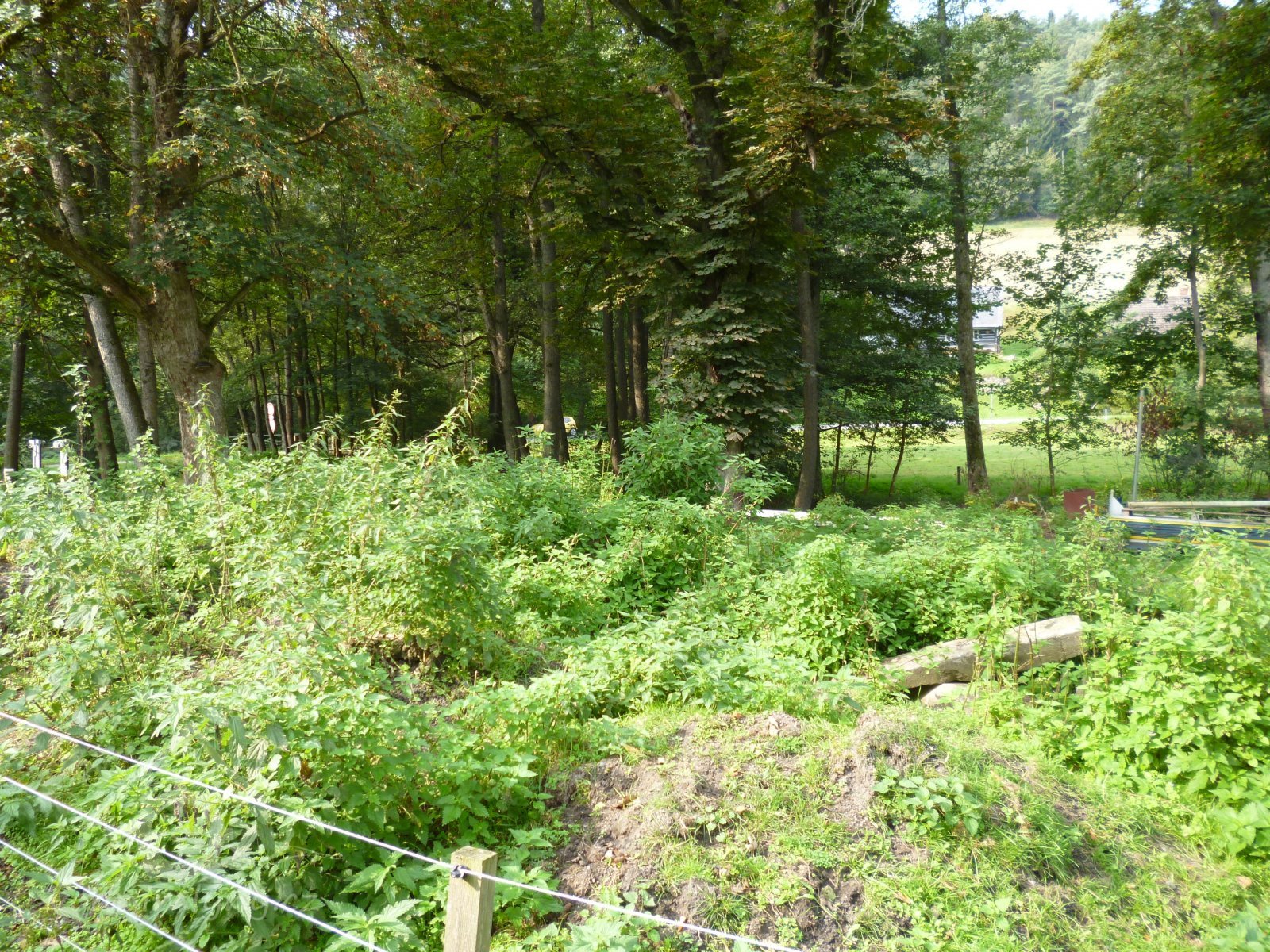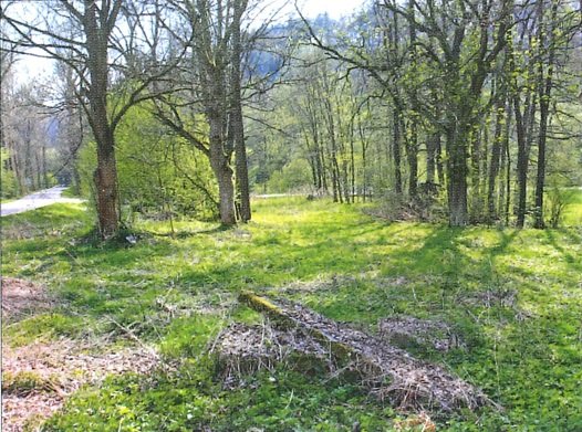 Neexistuje. Pozemek je oplocený, neudržovaný, rostou na něm vzrostlé stromy.