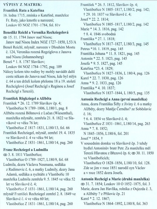 V letech 1784-1792 jsou v loukovské matrici uváděni ve slavíkovském mlýně Beneš Reichl z Dlouhého Mostu s manželkou Veronikou rozenou Regziglovou z Janova nad Nisou čp. 124, svatba 15.11.1784, v roce 1.8.1787 se jim na mlýně narodil syn Beneš.