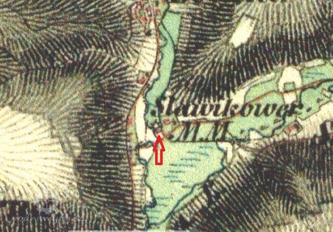 9.1.1930 Popis vodního díla: Pevný jez je ve špatném stavu z kamenné rovnaniny bez poevné koruny pouze z násypu a drnu v délce 10 m na potoce Oharce v osadě Slavíkov. Pravý břeh jest v katastru obce Chvalčovice, levý v katastru obce Radostín. Náhonem voda se voda na mlýn čp. 32 ve Slavíkově, odpad se zaúsťuje do potoka Oharky. Fixní bod osazen 1876 ve vzdálenosti 7,7 m od pravého sloupku vpouštěcího stavítka do náhonu a ve vzdálenosti 3 m od pravého břehu náhonu.