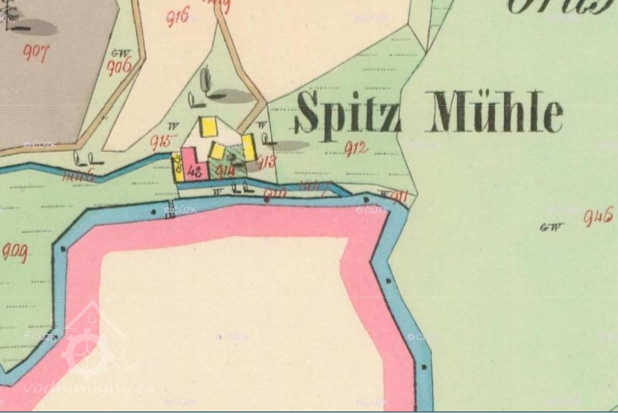 Popis1930: 1 kolo na svrchní vodu, hltnost 0,194 m3/s, spád 3,3 m, výkon 5,5 HP