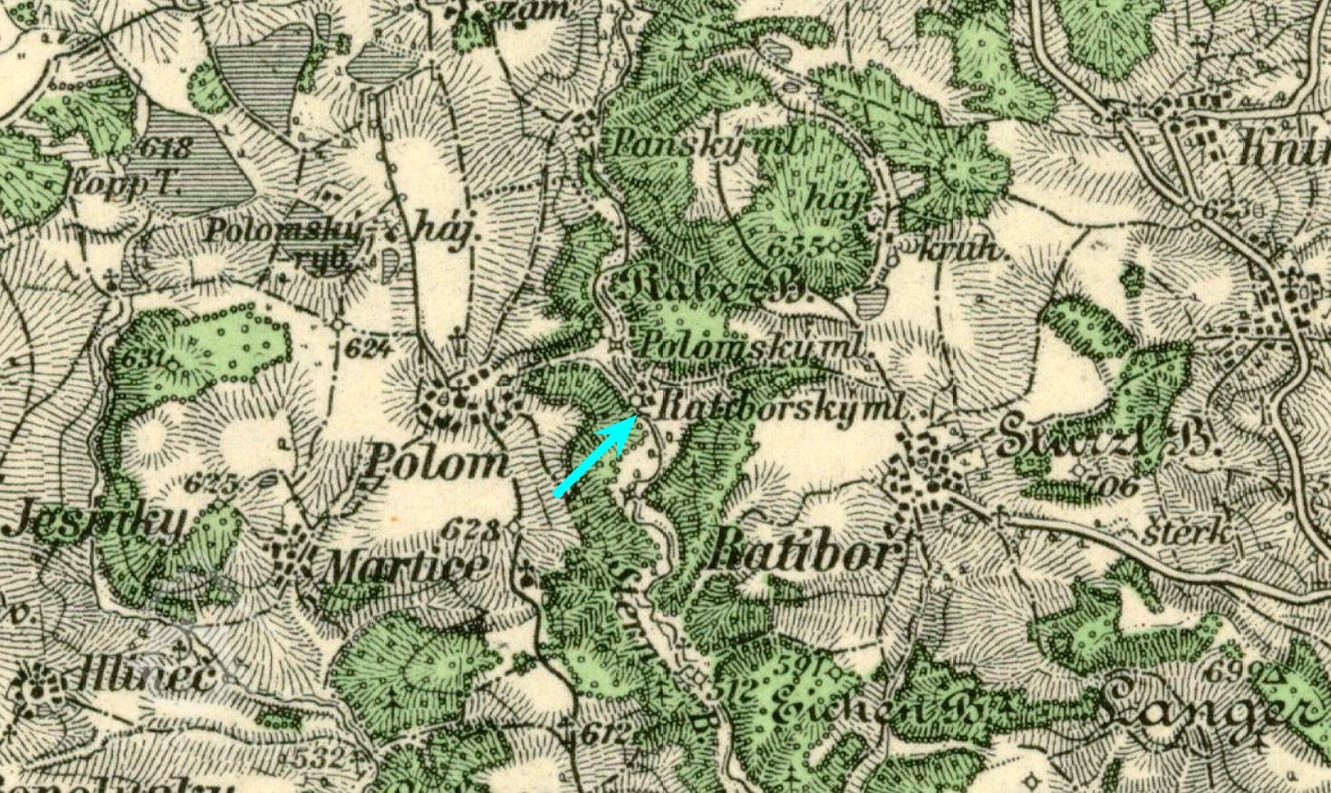 Původně patrně panský vodní mlýn, nazývaný Ratibořský mlýn (Ratiworzer Mühle), nechali vystavět snad již ve středověku majitelé zdejší tvrze a panství podle návrhu neznámého architekta na levém břehu Ratibořského potoka (Stern Bach) v údolí při cestě do Polomi asi 1,2 kilometru severozápadně od vsi Ratiboř (Ratiworz). V těsné blízkosti výše po proudu potoka stával na protějším břehu ještě Polomský mlýn (Pohlmer Mühle).
