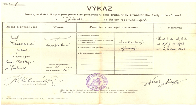 od 1. 1.1910 do 6. 1.1913. Zde 10. 1.1913 získal vysvědčení za vyučenou.
