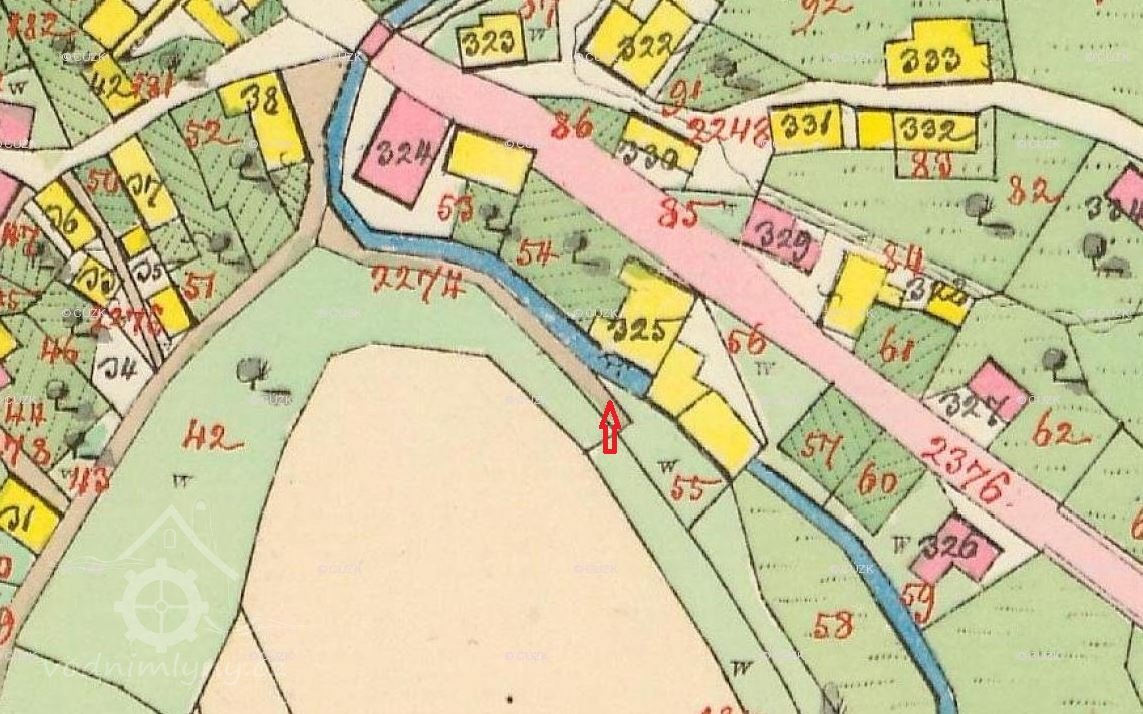 1945: 1 kolo na vrchní vodu, prům. 380 cm, šíře mezi vezi věnci 170 cm. Při spádu 420 cm a průtoku 260 l/s dává výkon 12 HP.