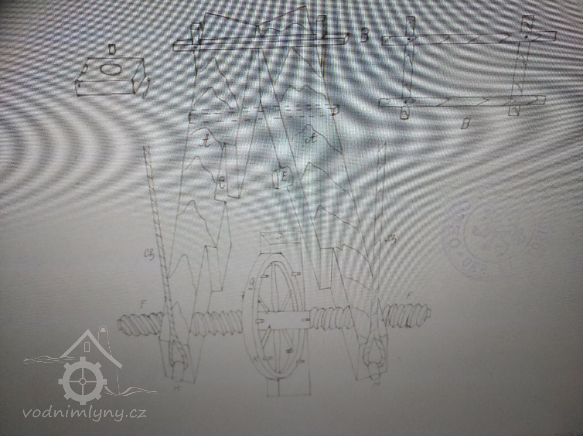 V hrázi žlab 26x16cm kterým se vede voda na kolo. Vodní kolo je 20´ v průměru a 2´široké. Kámen mlýnský 31“. Vodní kolo dřevěné dvouvěncové na vrchní vodu průměr 6,16 m šířka 0,63m