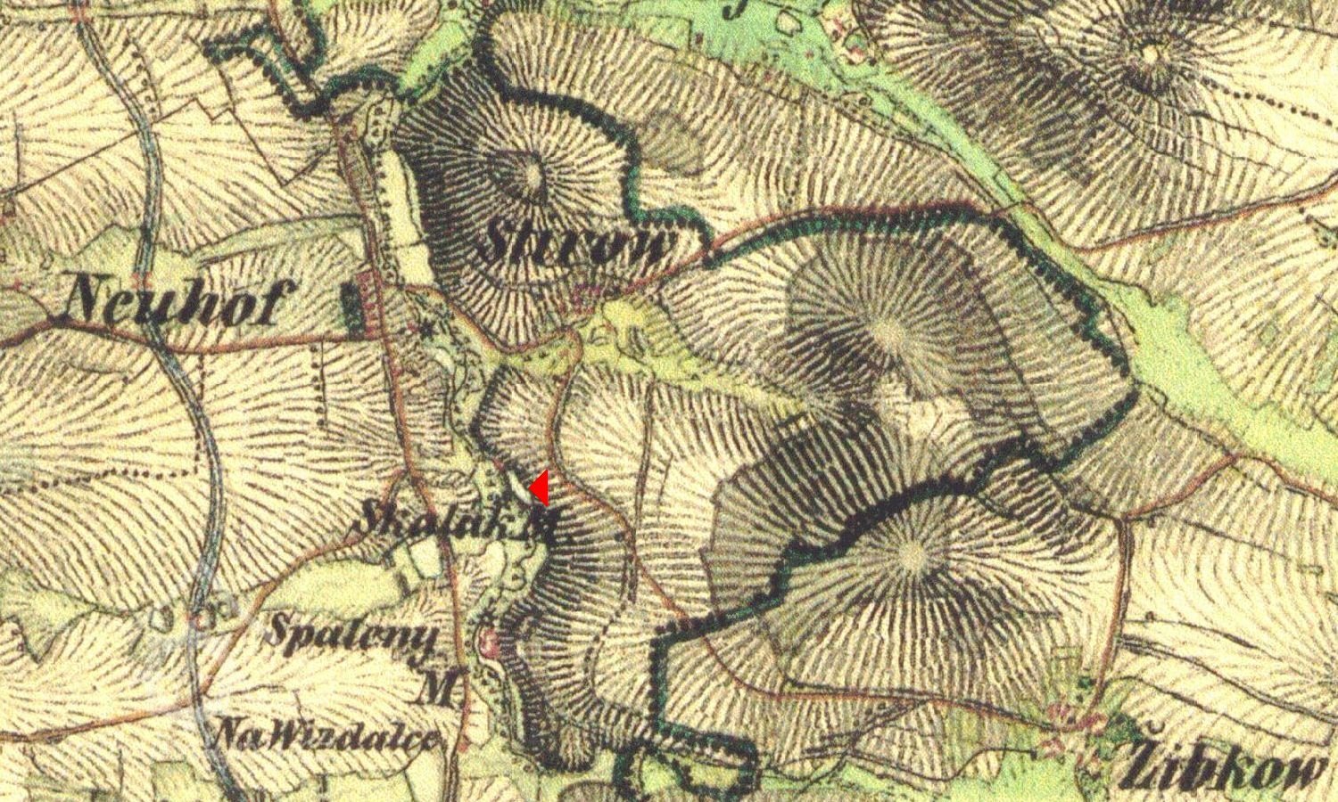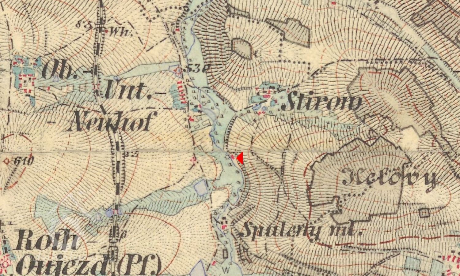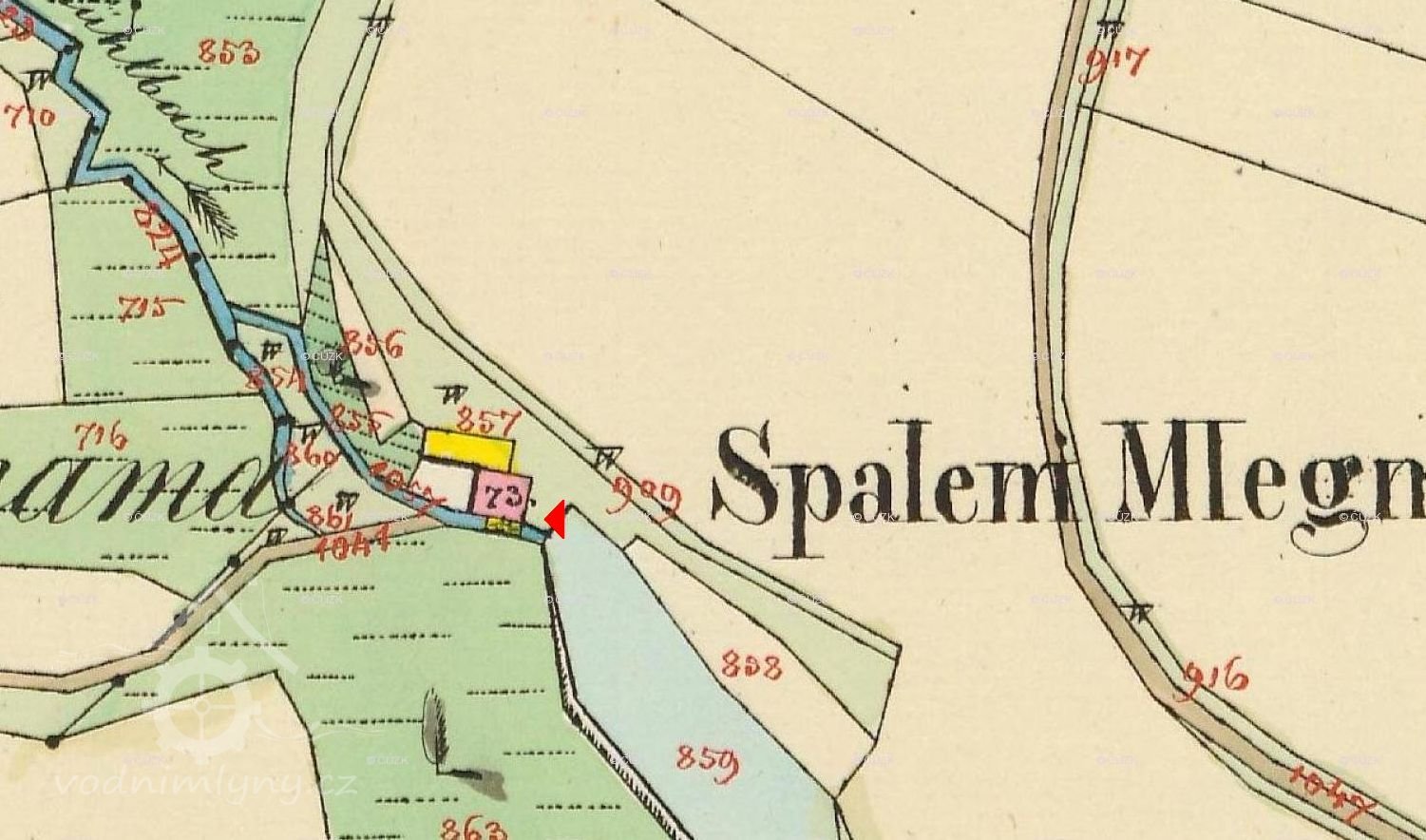 ...“Sotva 0,5 km na sever (myšleno od Heranova mlýna-poznámka přispěvatele) je osamělé stavení, kterému se říká „Spálený mlýn“. Náhon vroubený olšemi připomíná, že tu skutečně mlýn býval; patřil Spálenkovi. Když asi před 30 lety vyhořel, vystavěli na spáleništi domek, ale mlýnu už nezřídili. Patří Anně Jelínkové z Dolních Nových Dvorů. Má tu nájemníka…“