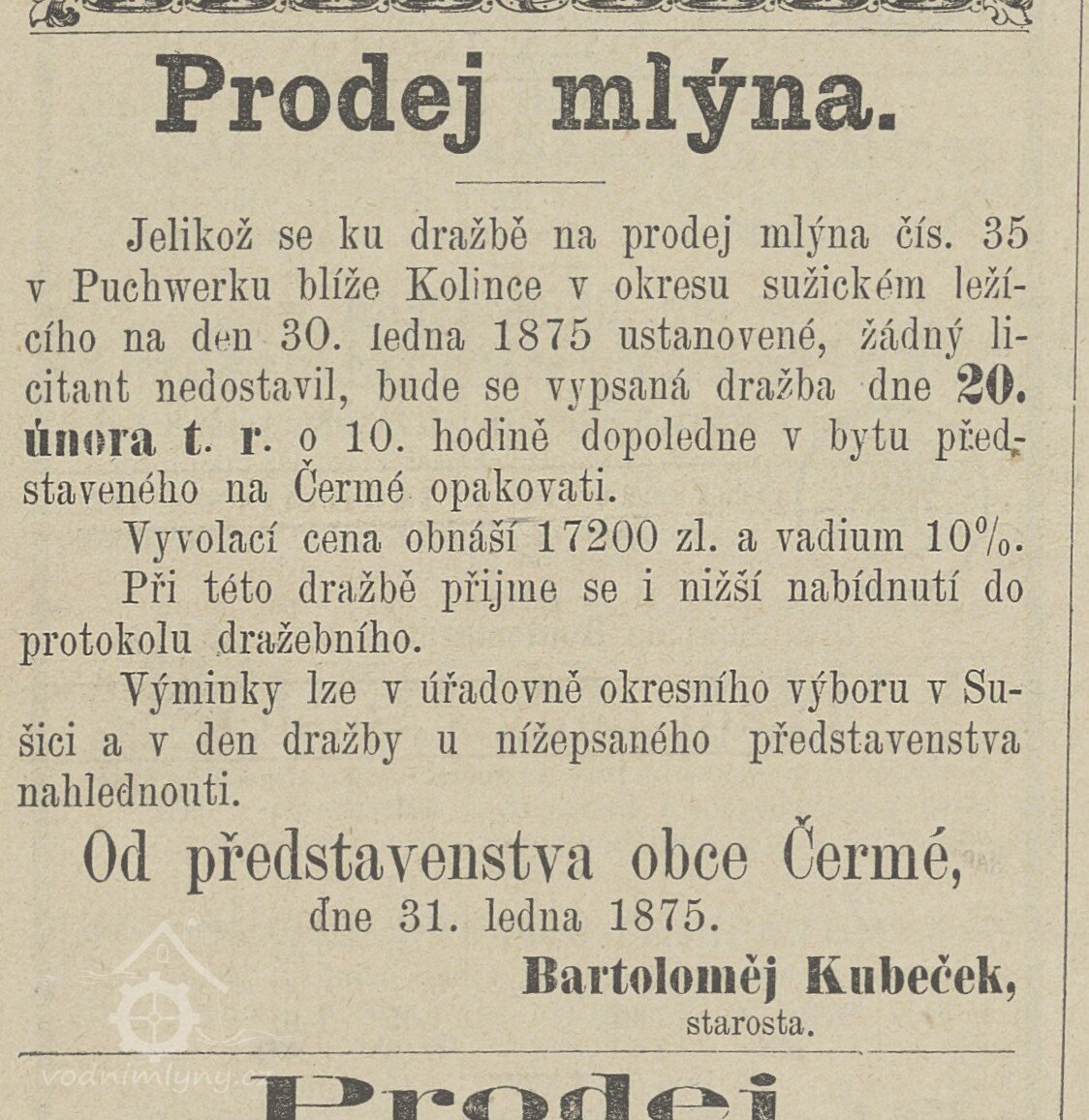 Puchverk, o samotě ležící mlýn v obci Čermé, na okresní silnici ze Sušice do Klatov.