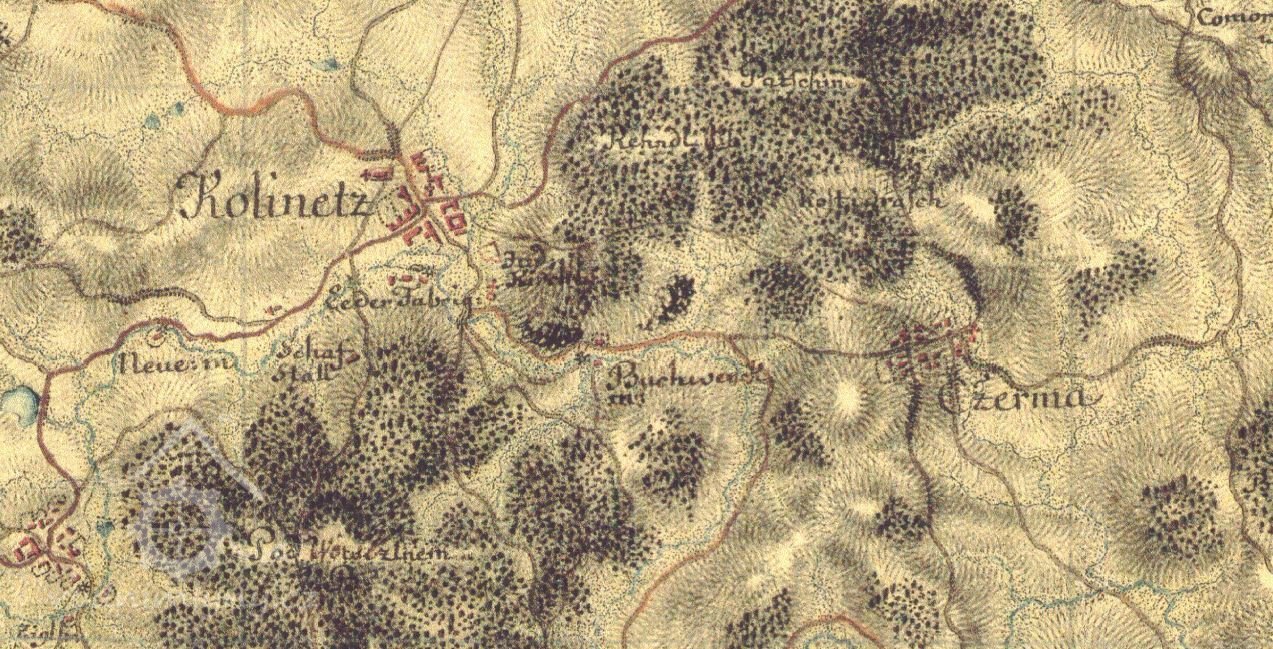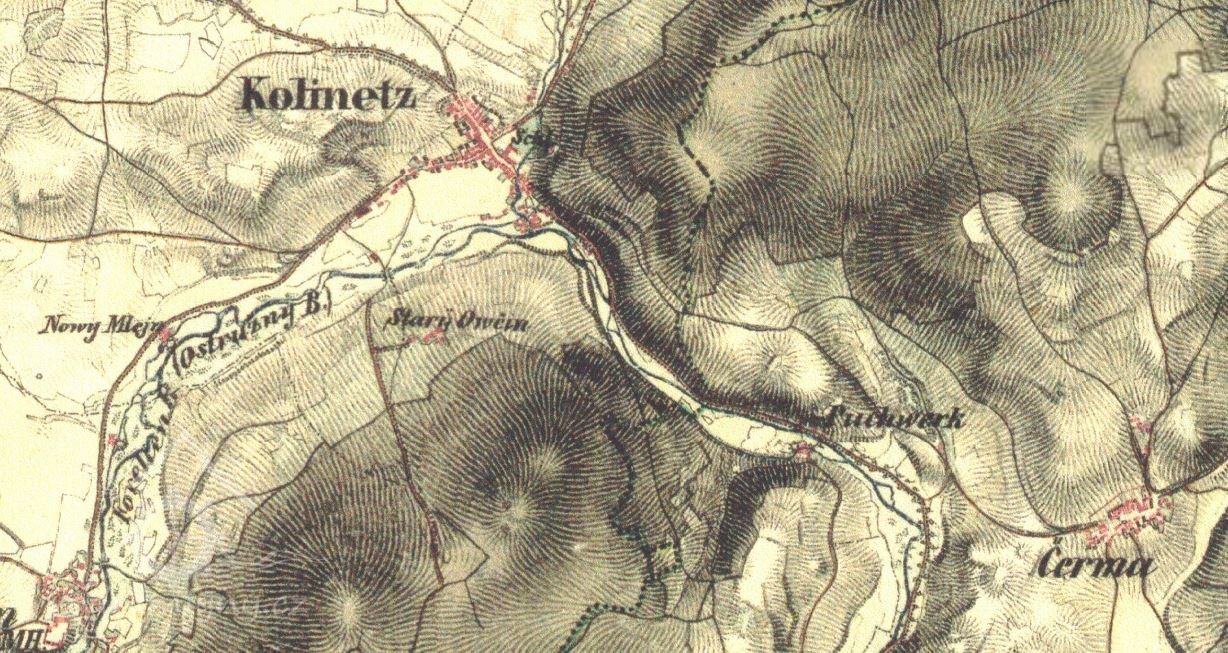Jihovýchodně od Kolince, směrem na Čermnou, po toku Ostružné
