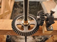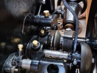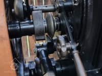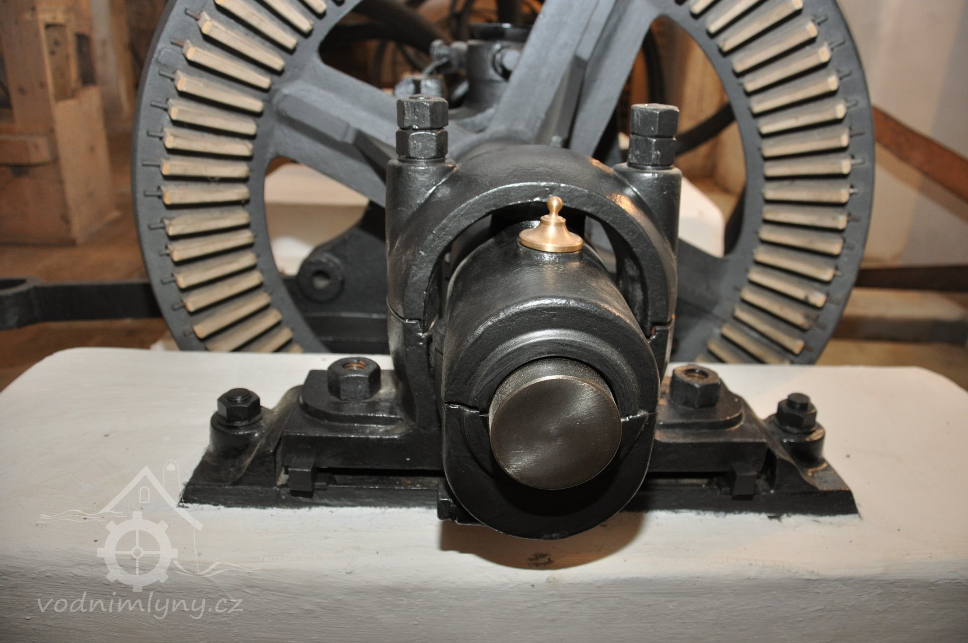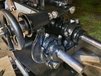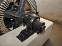 Detail kroužkomazného kluzného ložiska Sellersova typu - (v kloubovém uložení)., 8.9. 2017, © David Veverka - restaurátor strojů, (Prvky na obrázku: transmise, řemenice, převody, transmise, řemenice, převody - ozubená kola, pastorky (průmyslový výrobek))