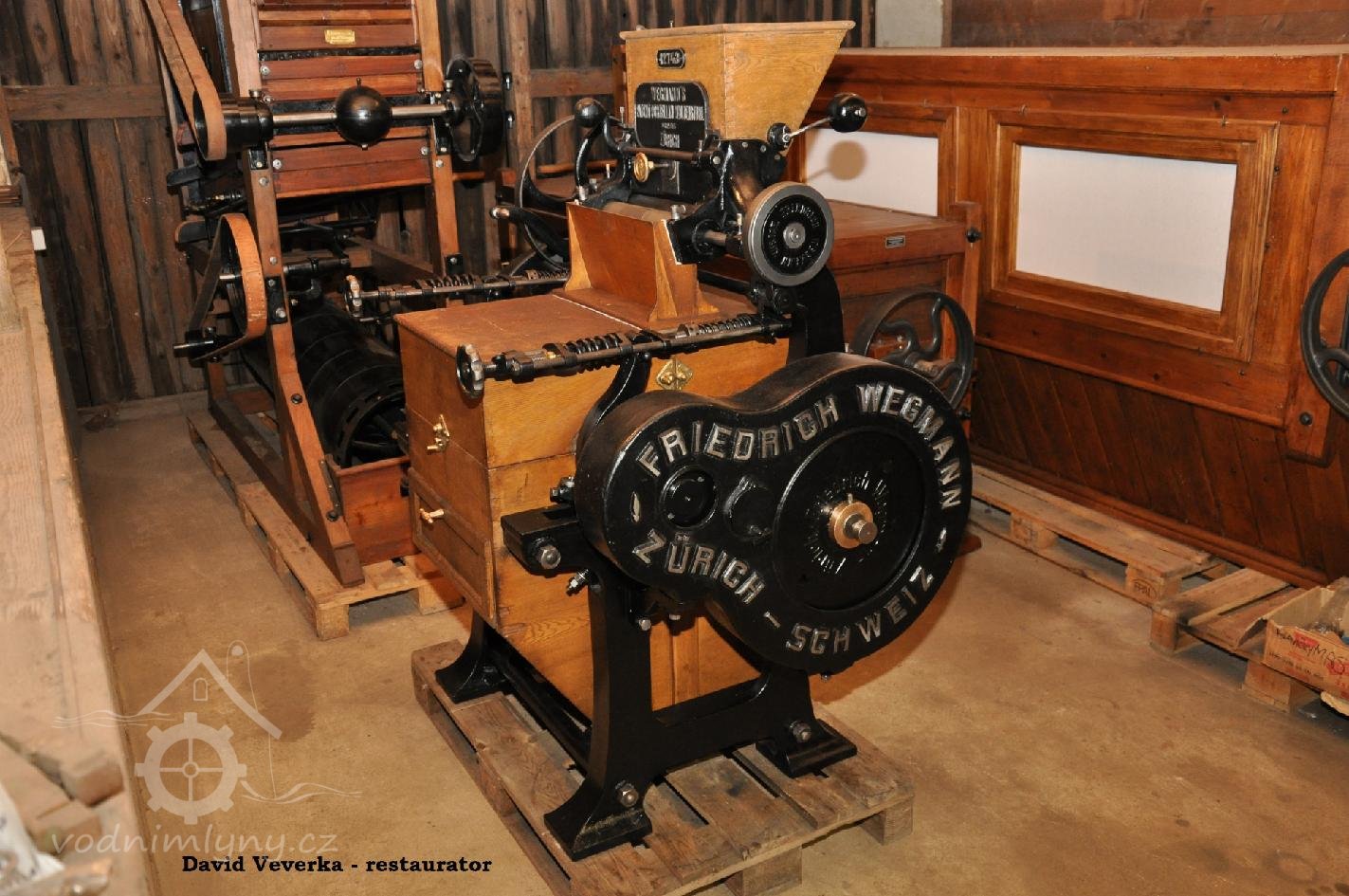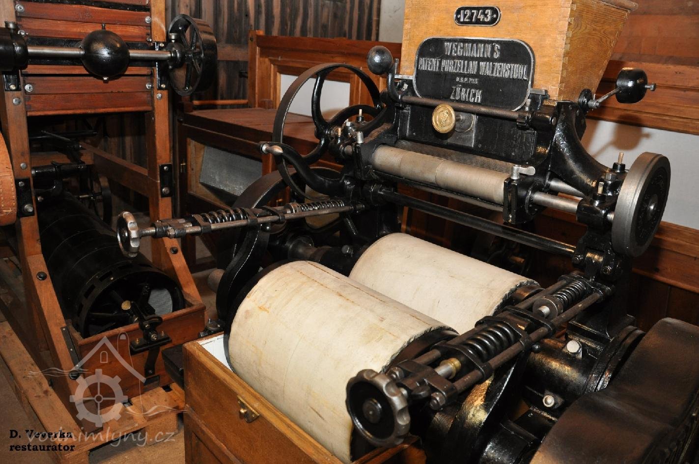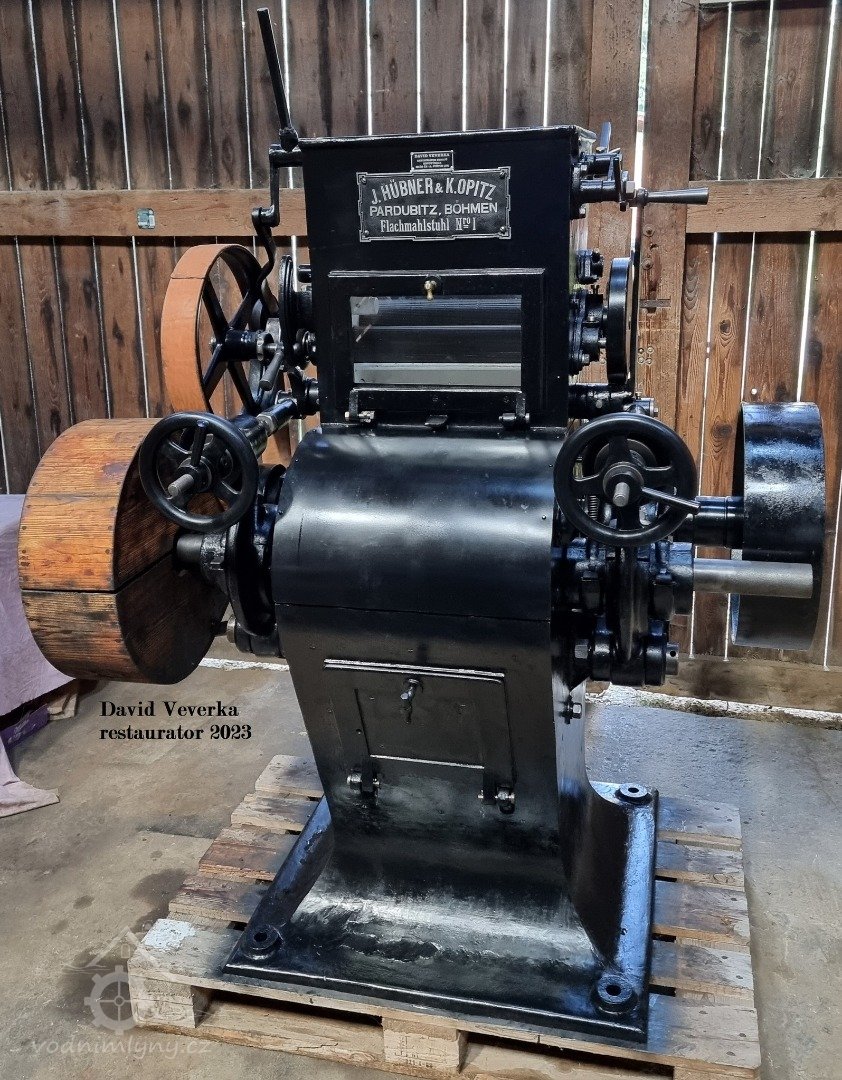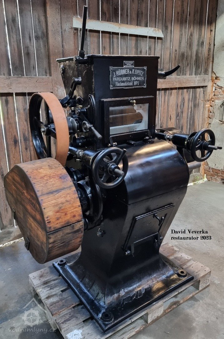 válcová mlecí stolice Friedrich Wegmann - Zürich, cca r. 1890 po kompletní renovaci a opravě do provozuschopného stavu, stroj restauroval David Veverka., 2024, © David Veverka, (Prvky na obrázku: válcová stolice)