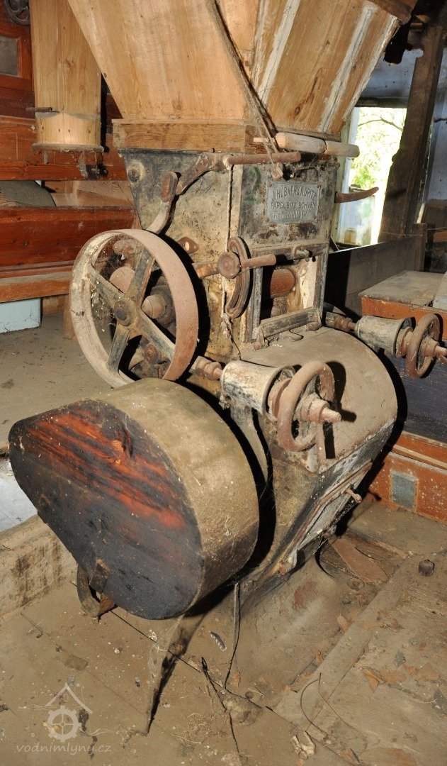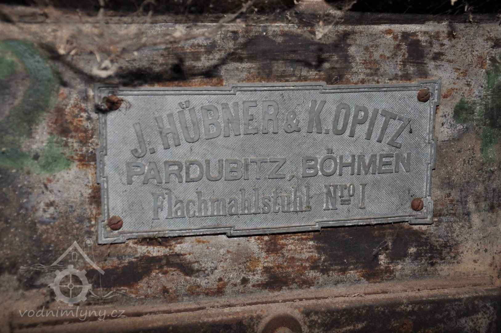 Válcová mlecí stolice od výrobce Hübner und Opitz - Pardubice, modelová řada r. 1898 ze zaniklého mlýna v Moravské Lieskové na Slovensku - štítek výrobce, 11 2023, © David Veverka, (Prvky na obrázku: válcová stolice, značka výrobce na technologickém vybavení)