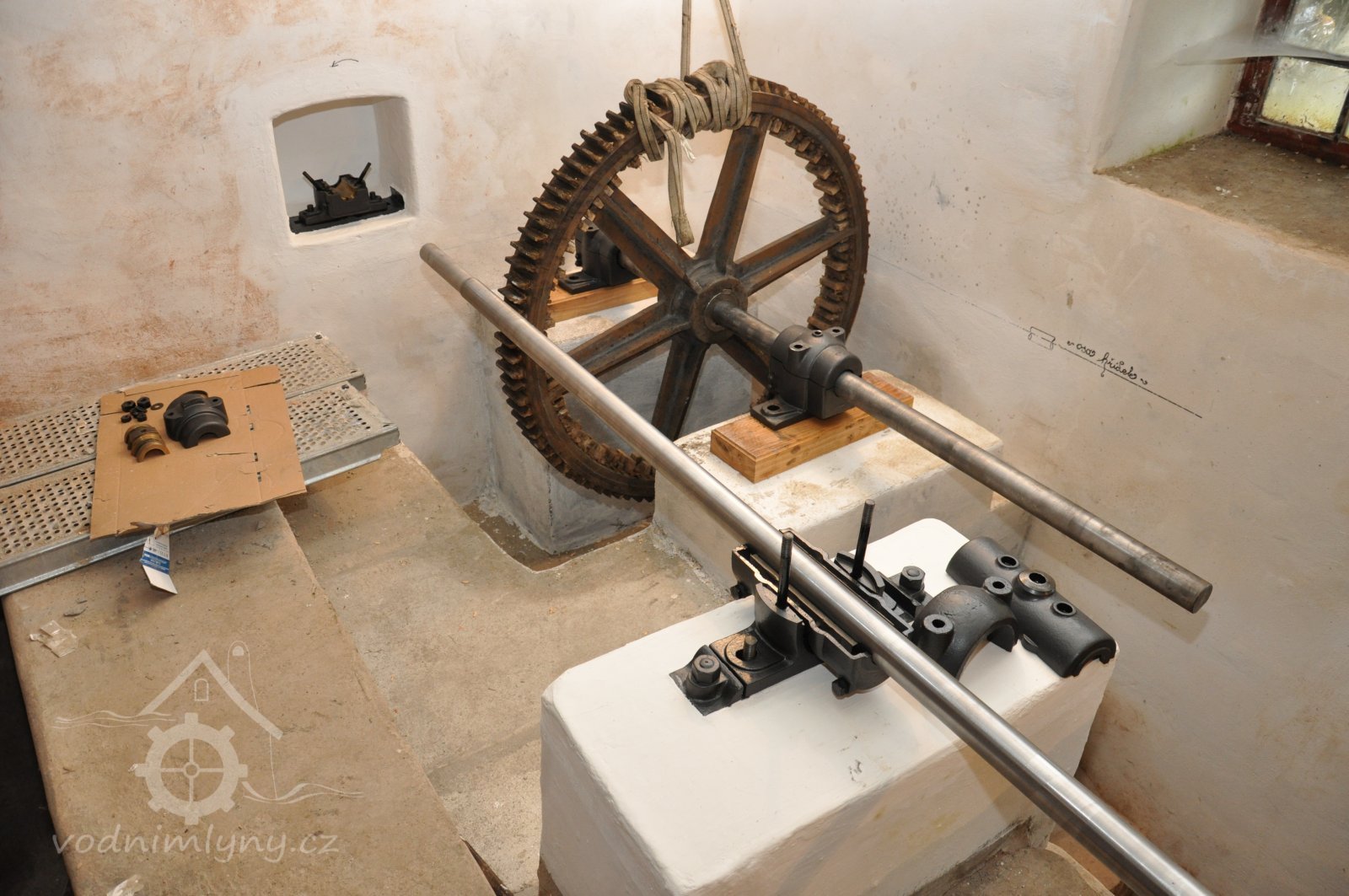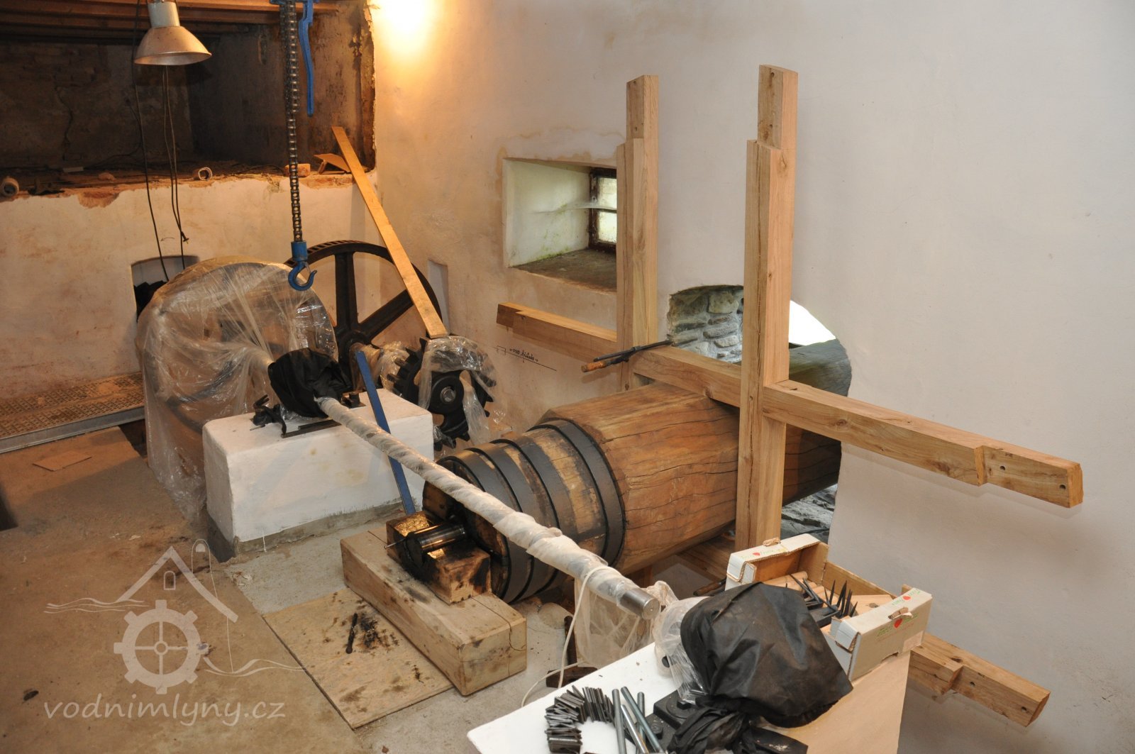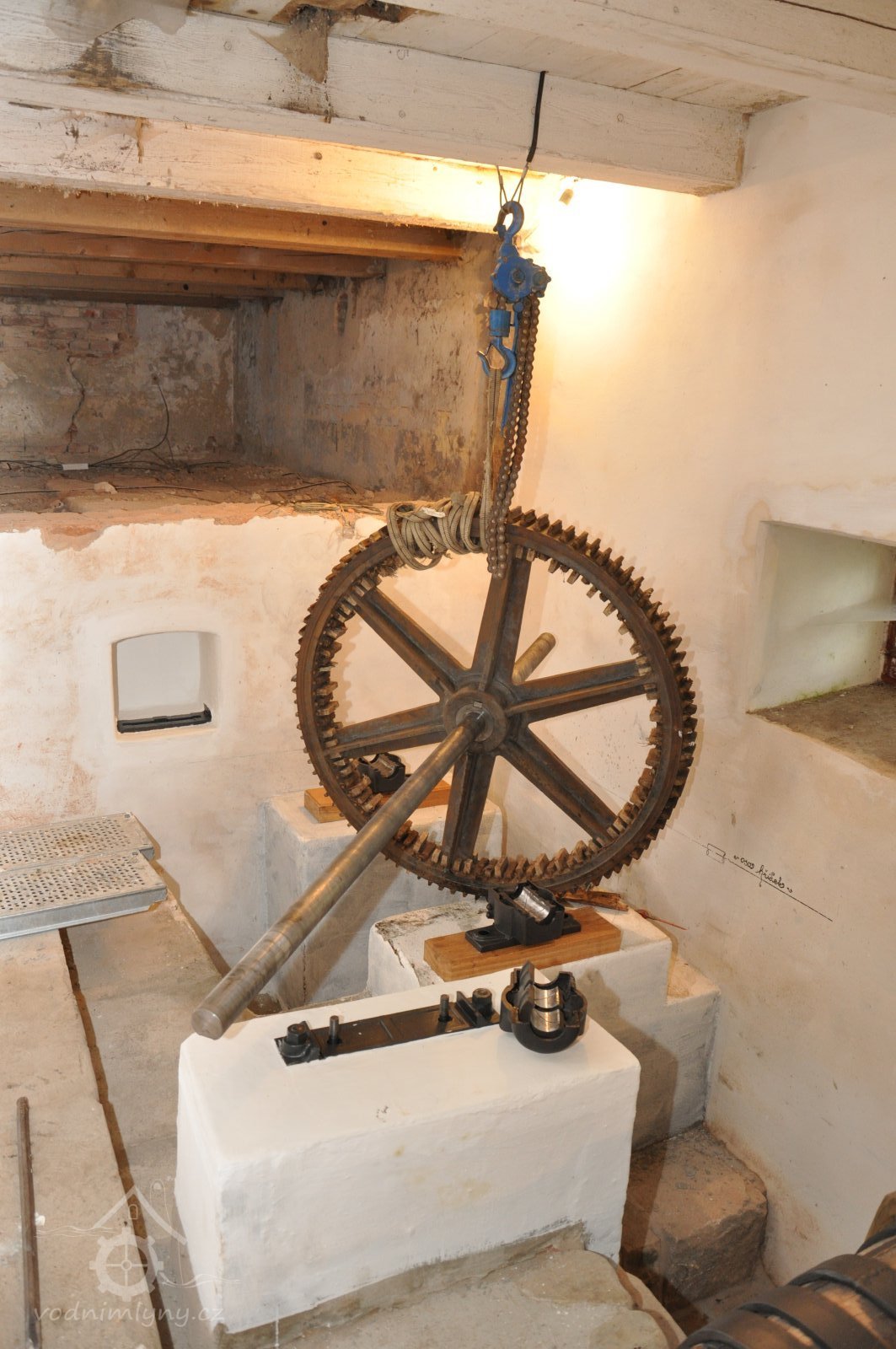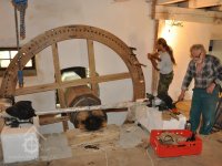 osazování předlohového převodu převezeného z Vamberova mlýna v Kameničkách u Hlinska, 2016, © foto, restaurování a repasé: David Veverka, (Prvky na obrázku: transmise, řemenice, převody)