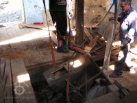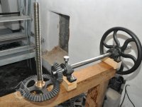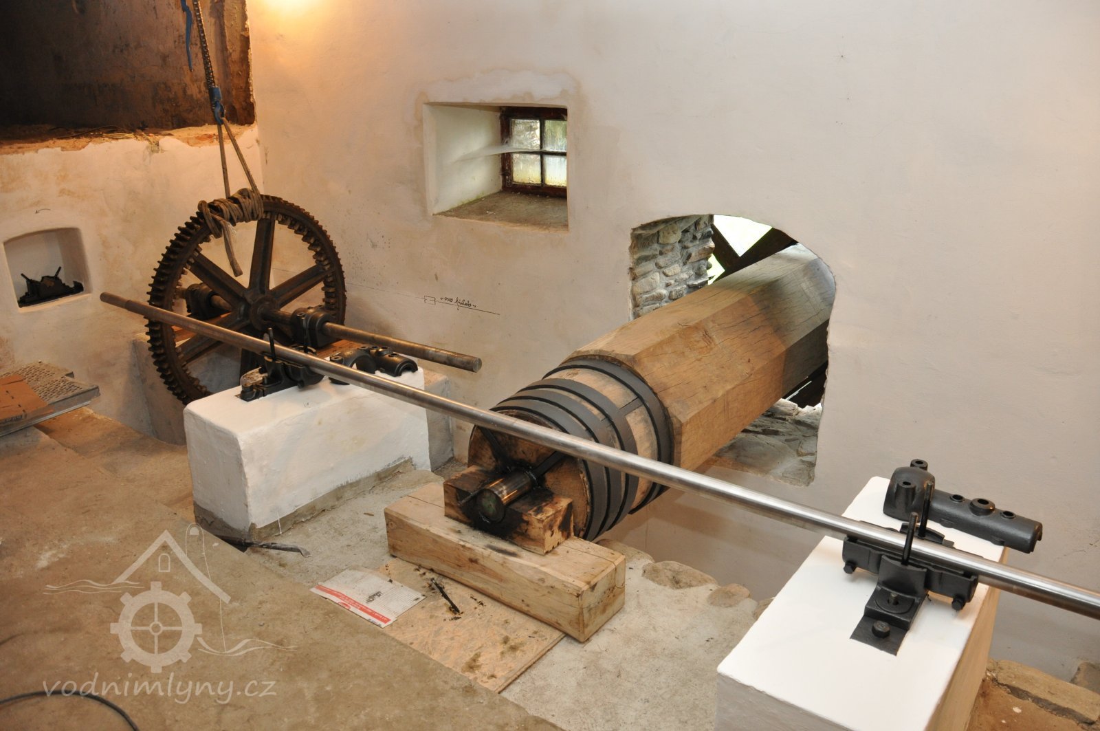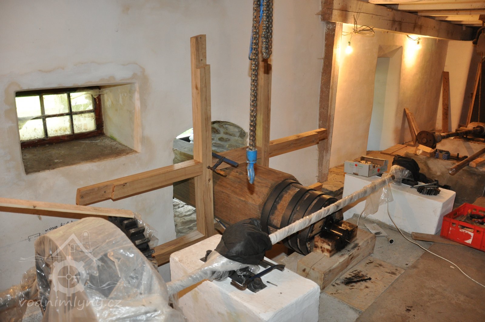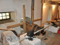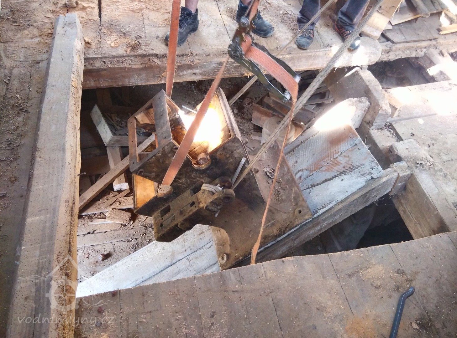 osazování předlohového převodu převezeného z Vamberova mlýna v Kameničkách u Hlinska, 2016, © foto, restaurování a repasé: David Veverka, (Prvky na obrázku: transmise, řemenice, převody)
