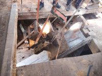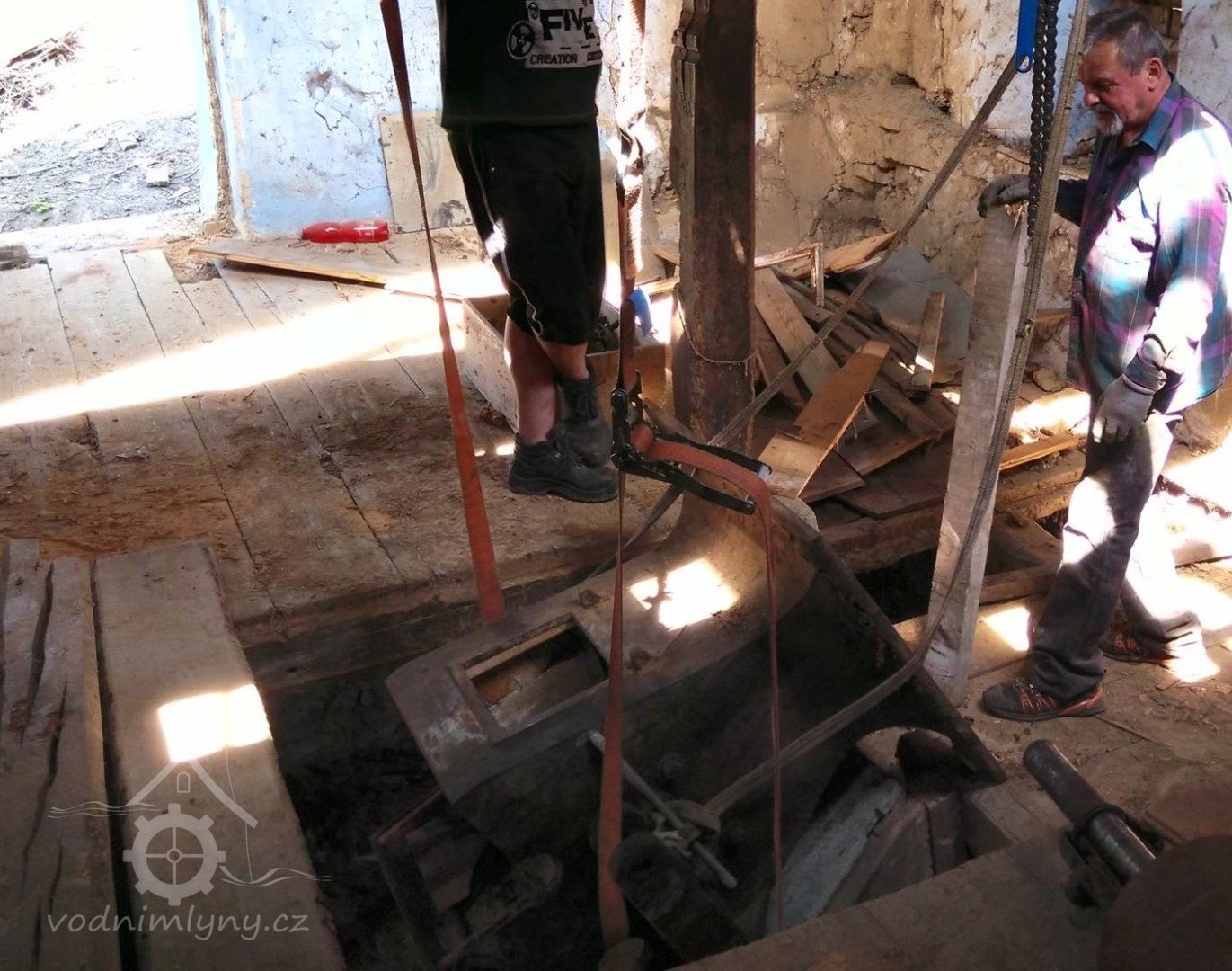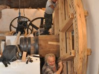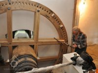 sekerník František Mikyška a syn pracuje na osazení nového palečního kola s bočními palci, 2016, © restaurátor strojů David Veverka, (Prvky na obrázku: transmise, řemenice, převody)