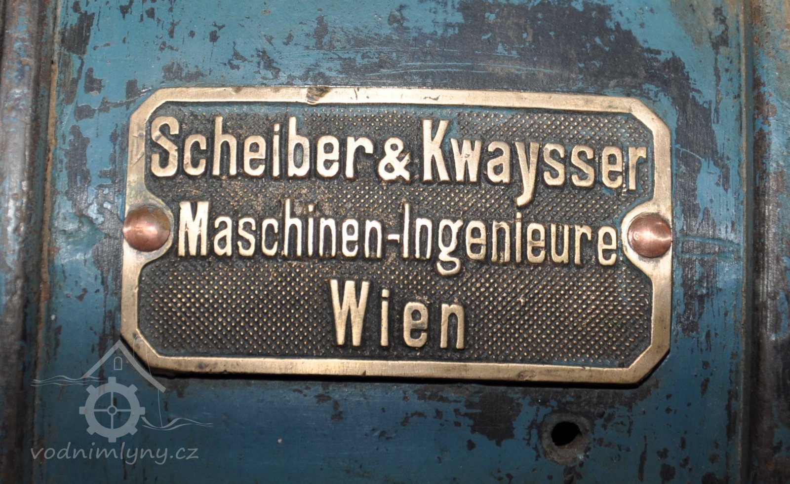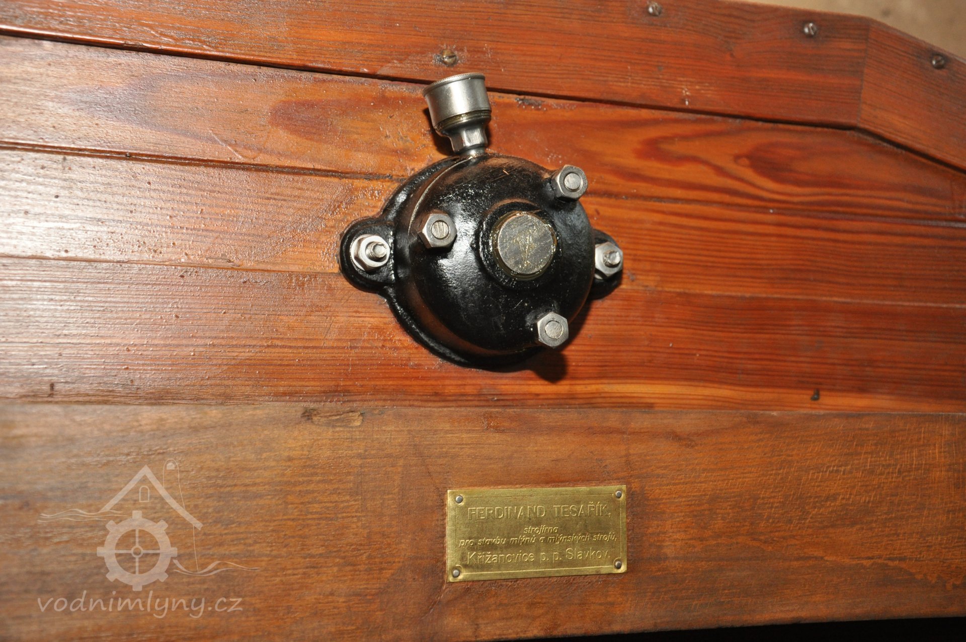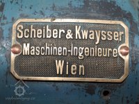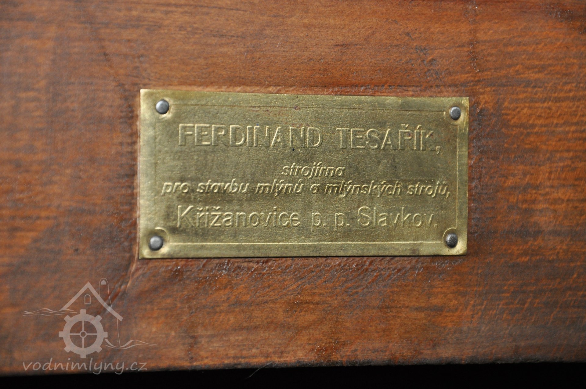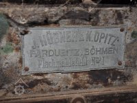 Štítek výrobce Ferdinand Tesařík - Křižanovice, Slavkov)., 2019, © David Veverka - restaurátor strojů, (Prvky na obrázku: značka výrobce na technologickém vybavení)