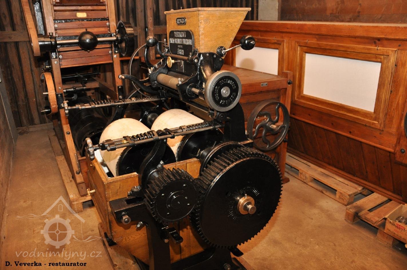 Válcová mlecí stolice Union - České Budějovice, vyrobená mezi léty 1912 až 1914 po kompletní citlivé renovaci do provozuschopného stavu (dále provedena oprava nenávratně opotřebovaných dílů autentickým způsobem a materiály). Uvnitř použito speciální barvy, aby stroj vyhovoval dnešním hygienickým požadavkům., 2017, © David Veverka - restaurátor strojů, (Prvky na obrázku: válcová stolice)