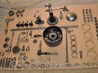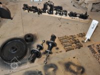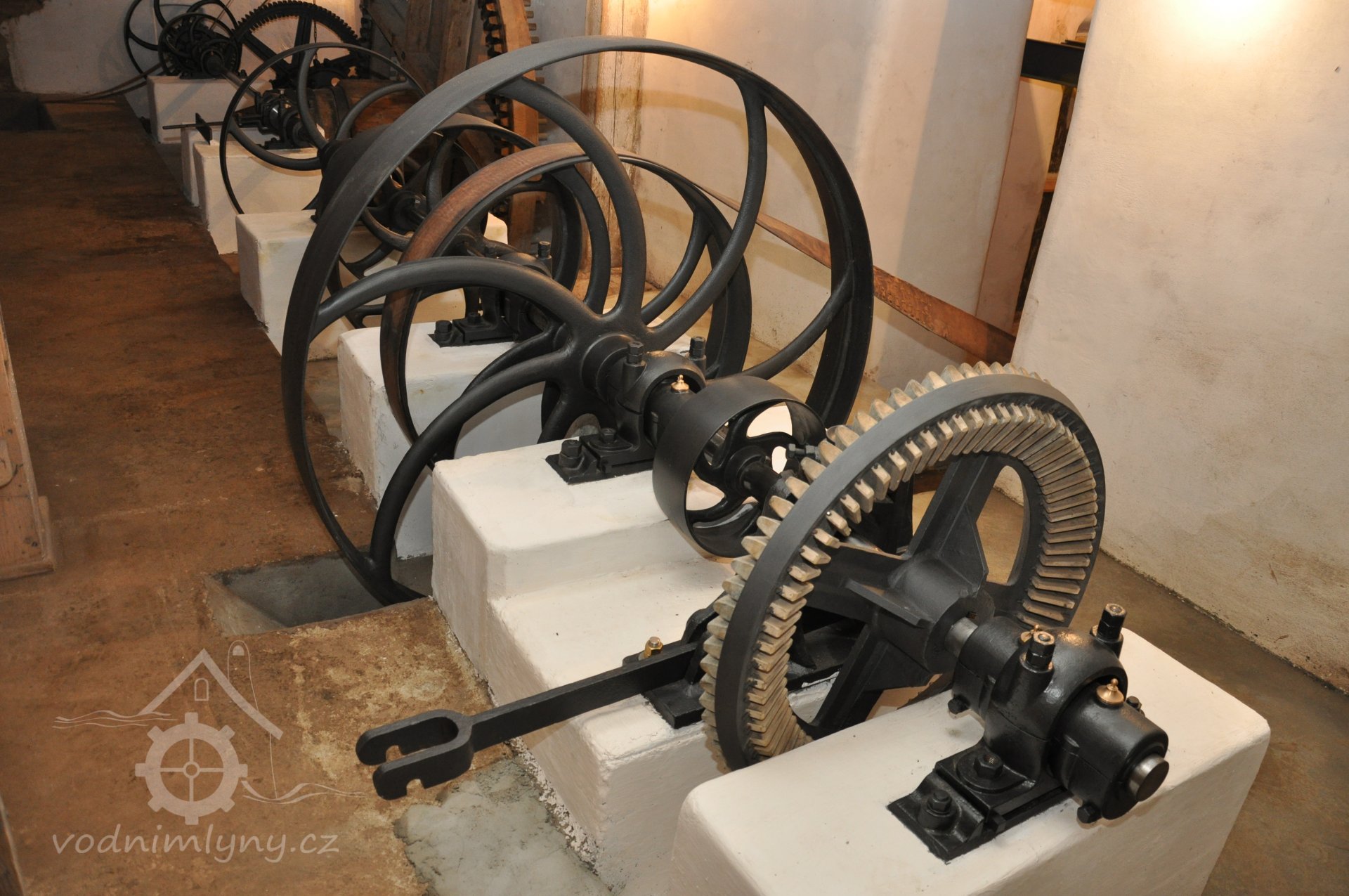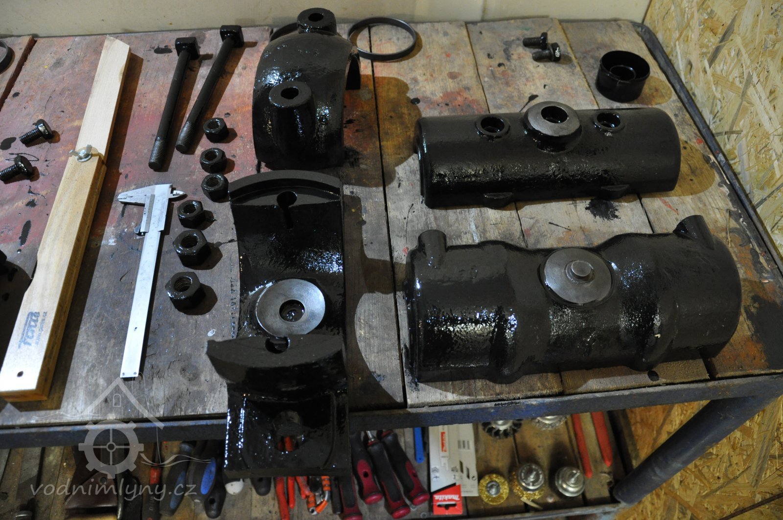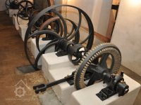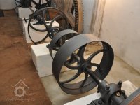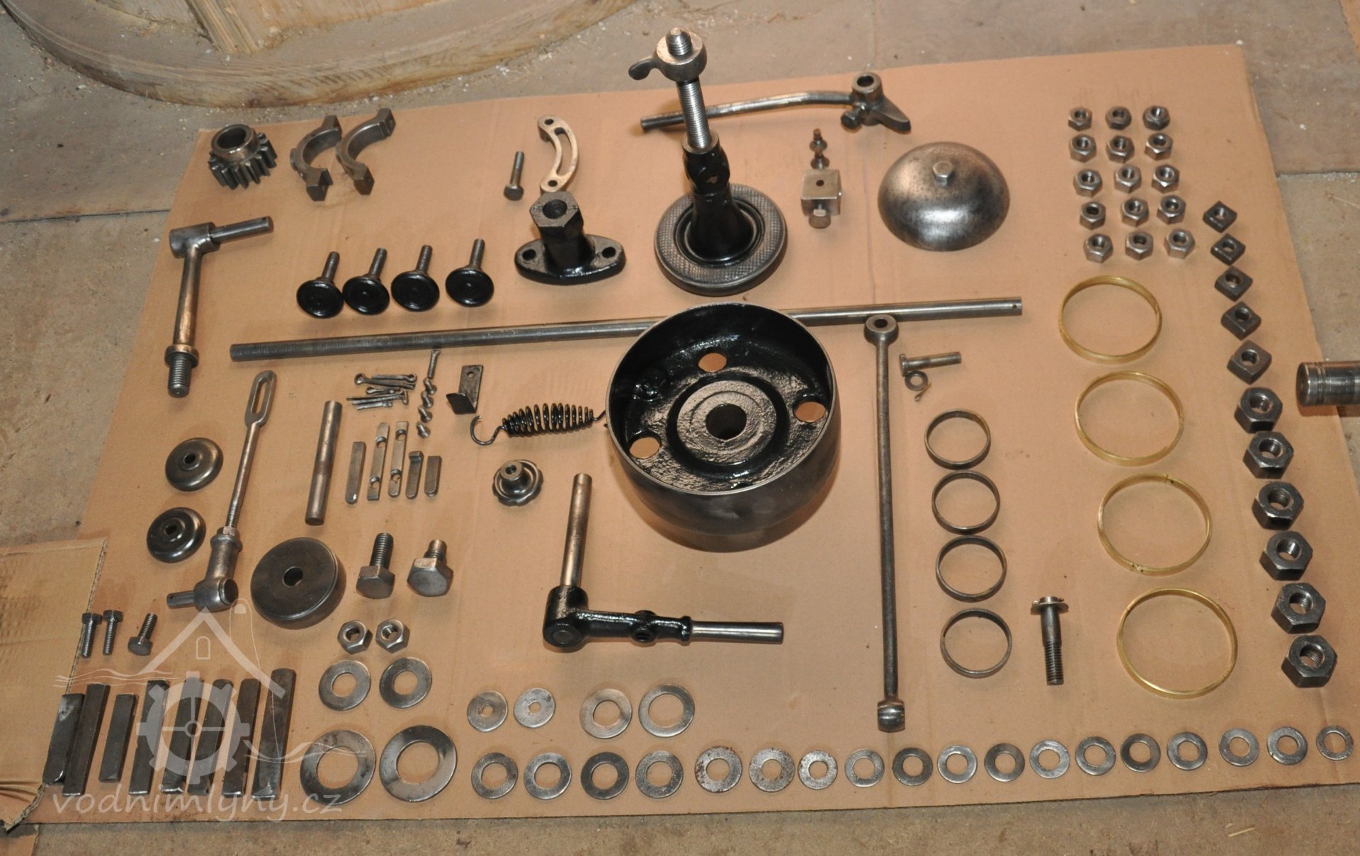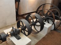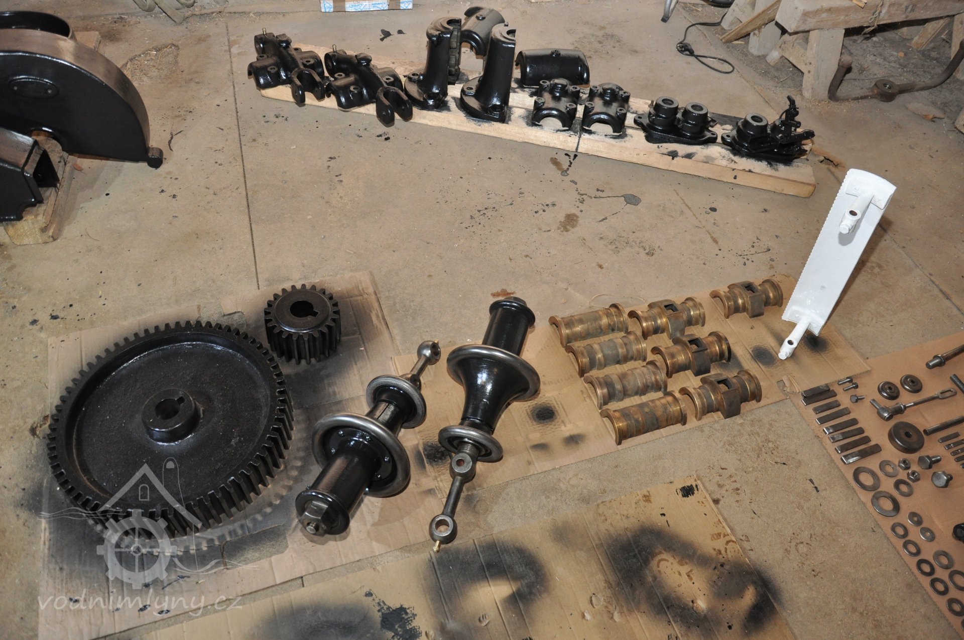 součásti nově vyrobeného palečního kola před sestavením, 2016, © restaurátor strojů David Veverka, (Prvky na obrázku: transmise, řemenice, převody)