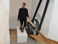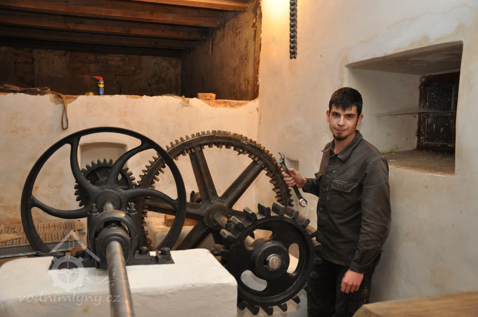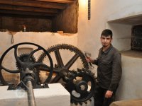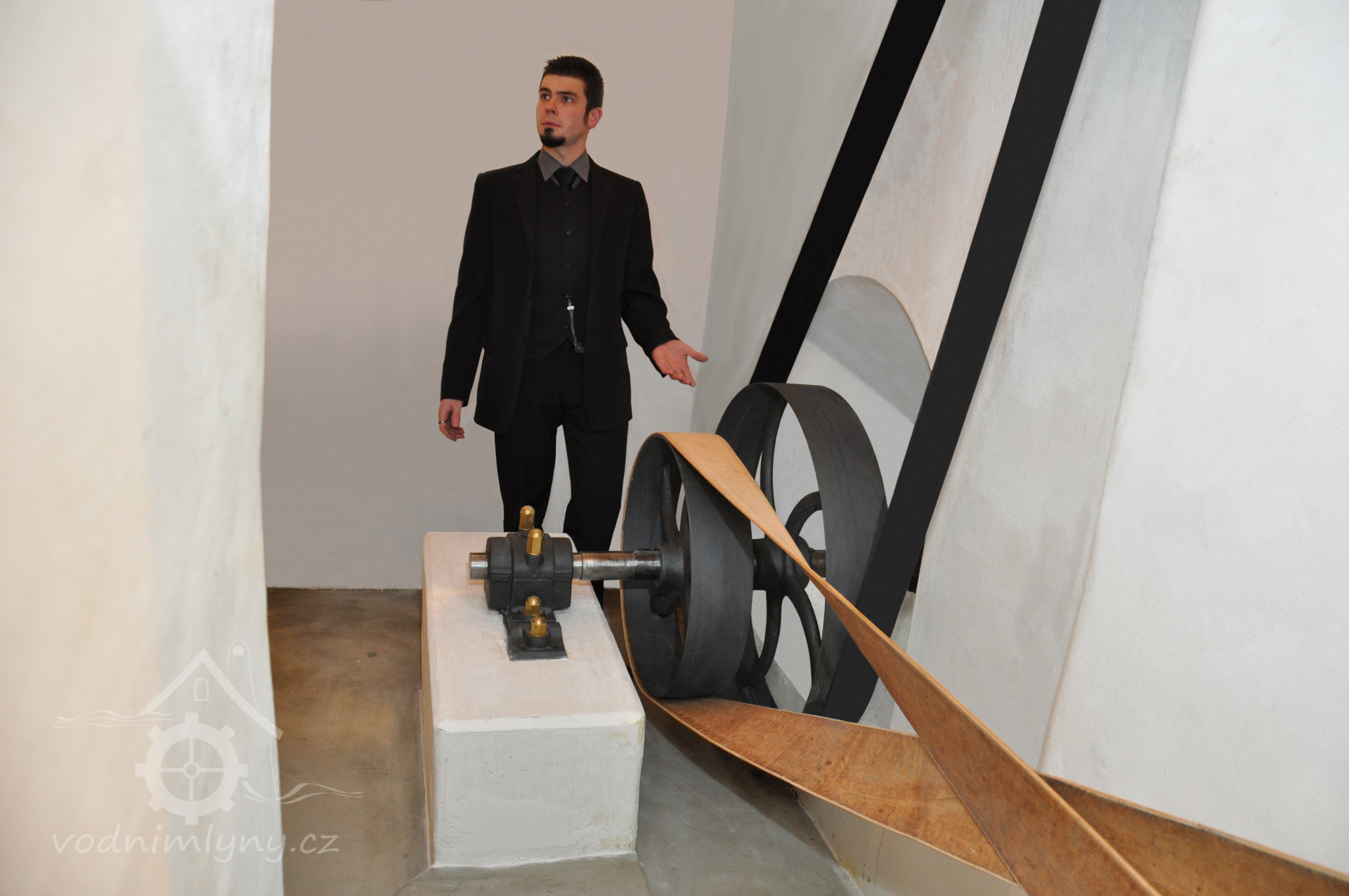 David Veverka - restaurátor strojů u turbíny, 2017, © Norbert Lindke, (Prvky na obrázku: Turbína, transmise, řemenice, převody)