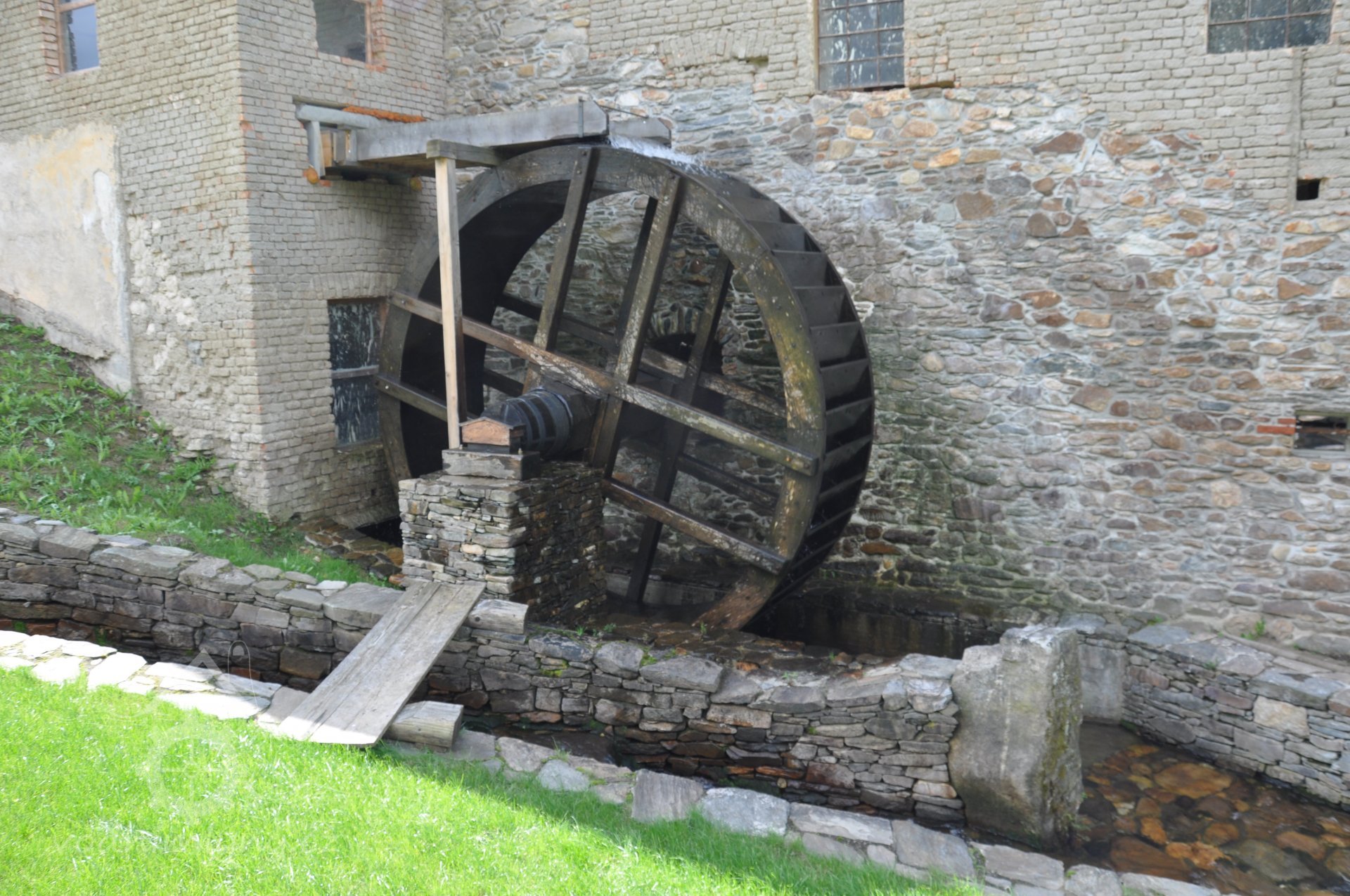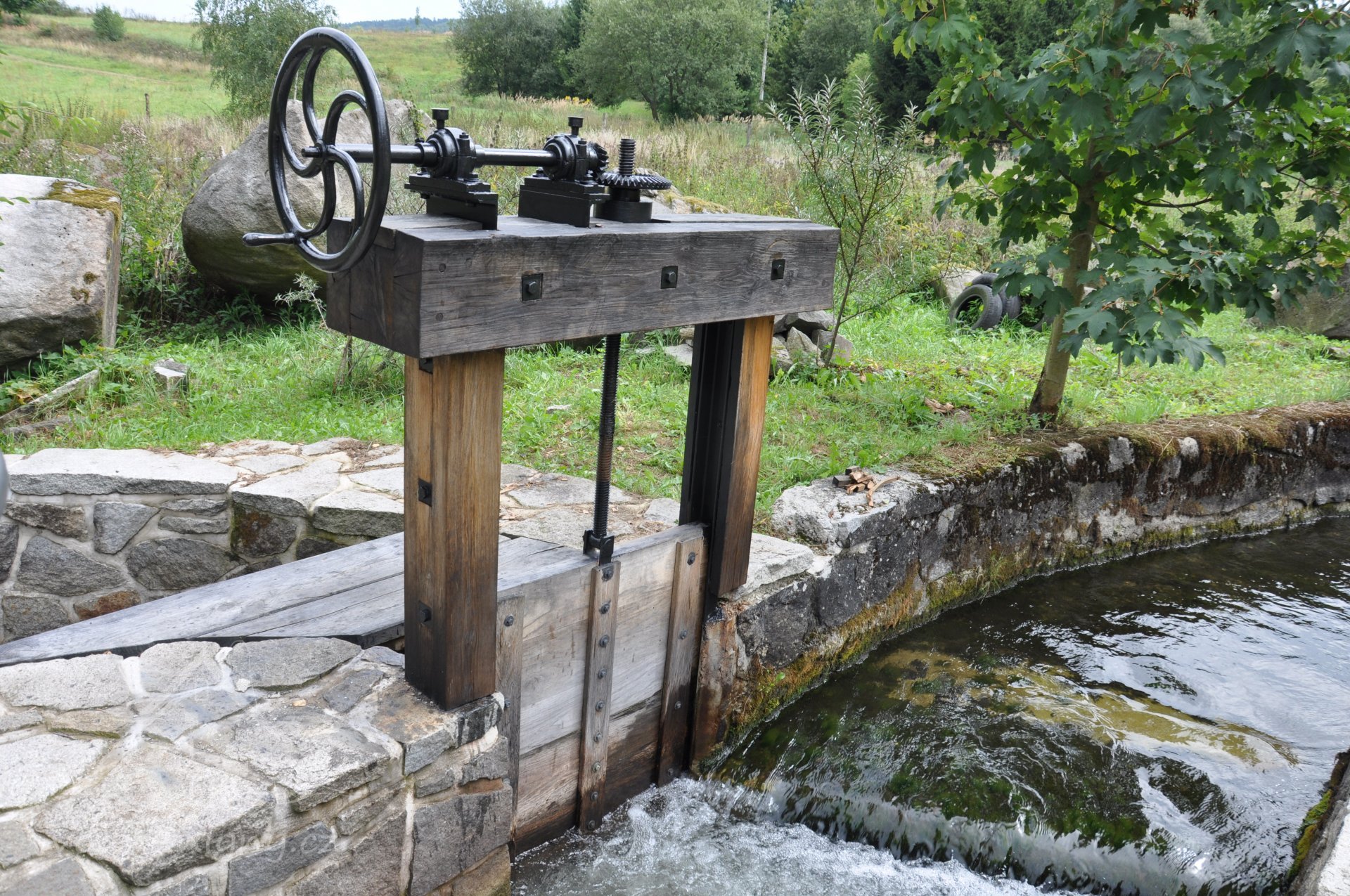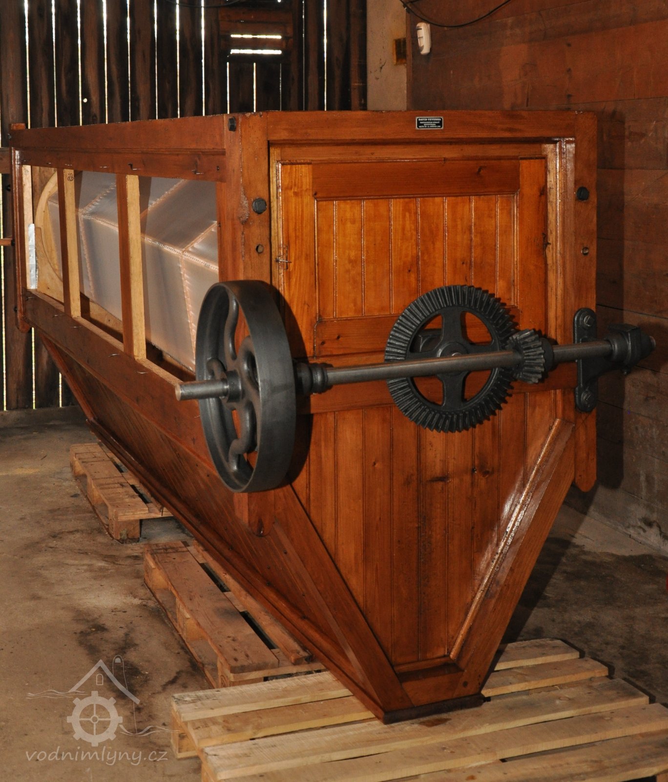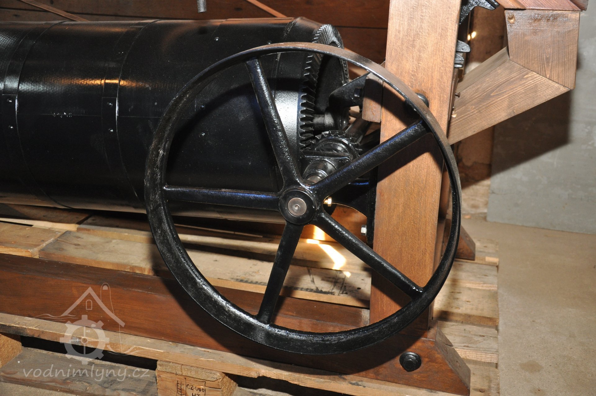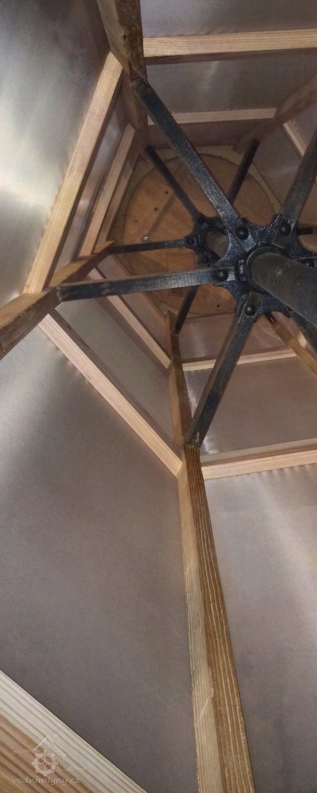 Vodní kolo na vrchní vodu. Výrobce: sekerník František Mikyška., 8.9. 2017, © David Veverka - restaurátor strojů, (Prvky na obrázku: Vodní kolo)
