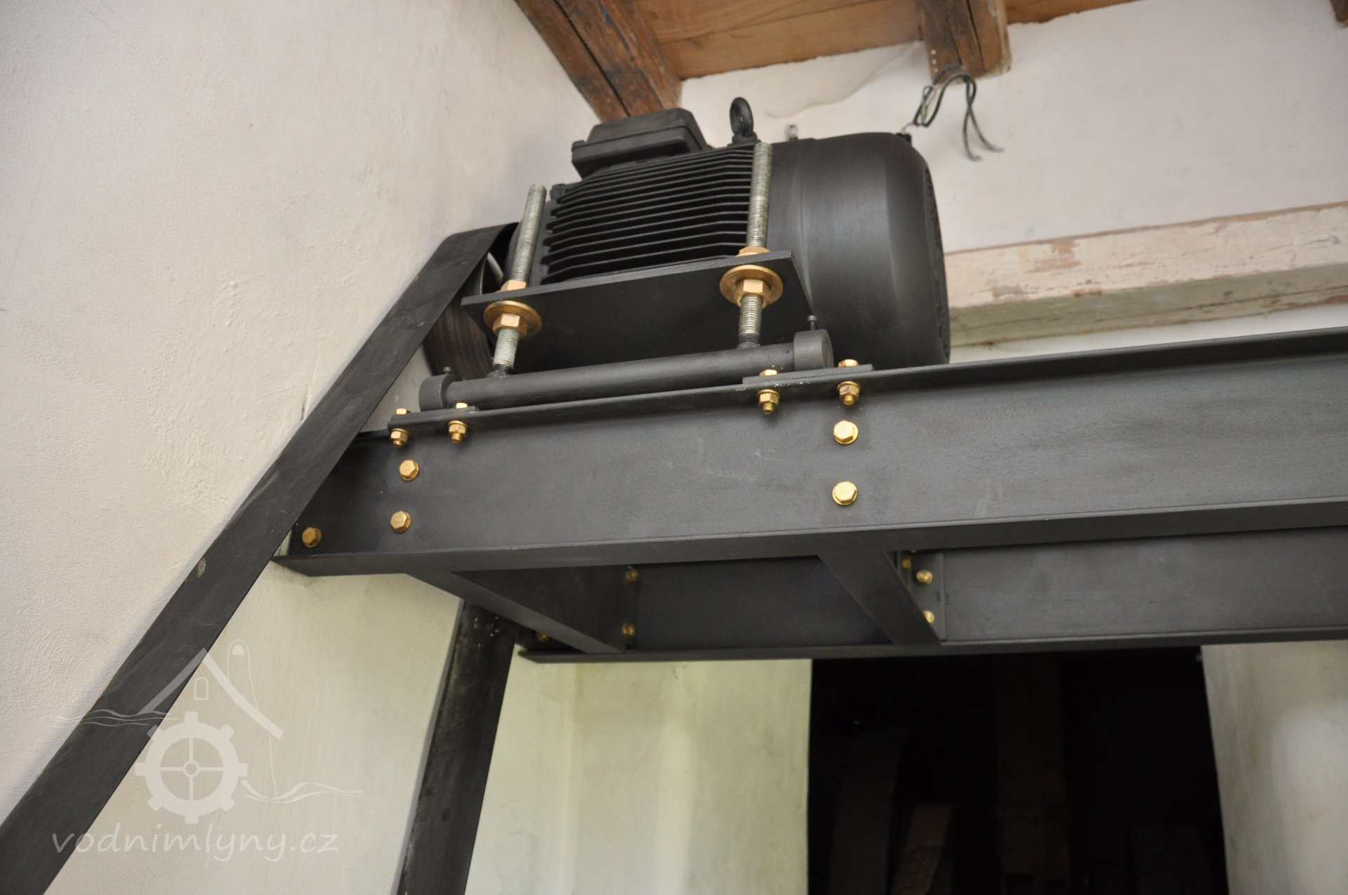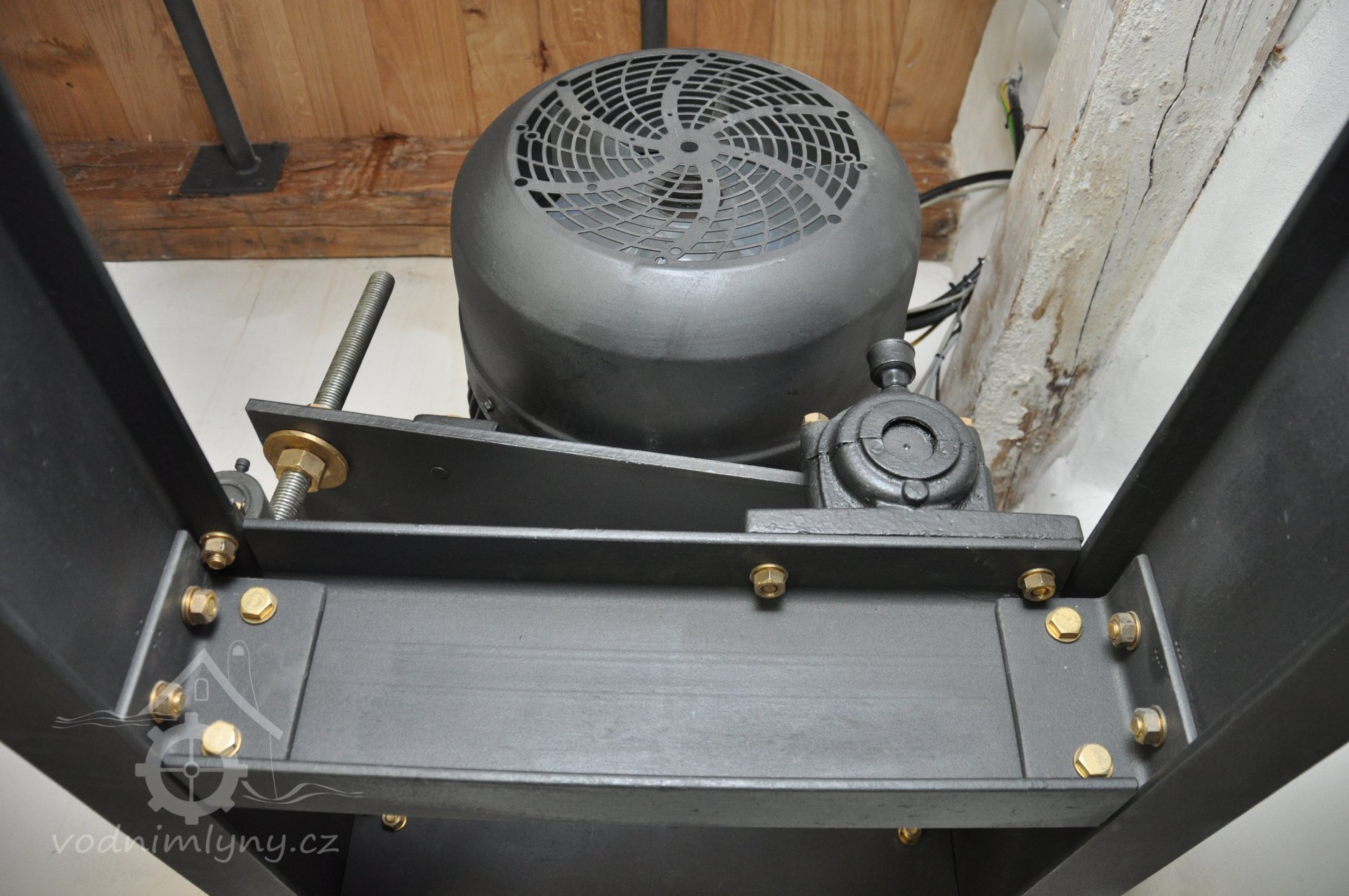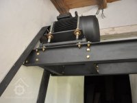 Nový asynchronní generátor o instalovaném výkonu 15 kW., 2017, © David Veverka - restaurátor strojů, (Prvky na obrázku: Generátor, dynamo, transmise, řemenice, převody)