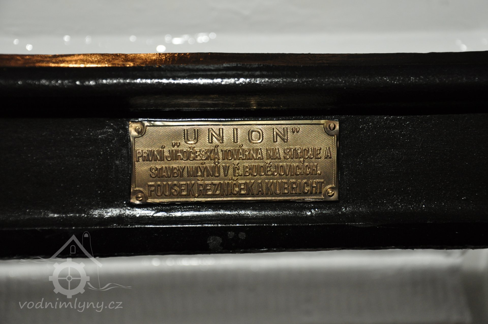 Štítek na stroji - Union České Budějovice - Fousek, Řezníček a Kubricht., 2017, © David Veverka - restaurátor strojů, (Prvky na obrázku: značka výrobce na technologickém vybavení)