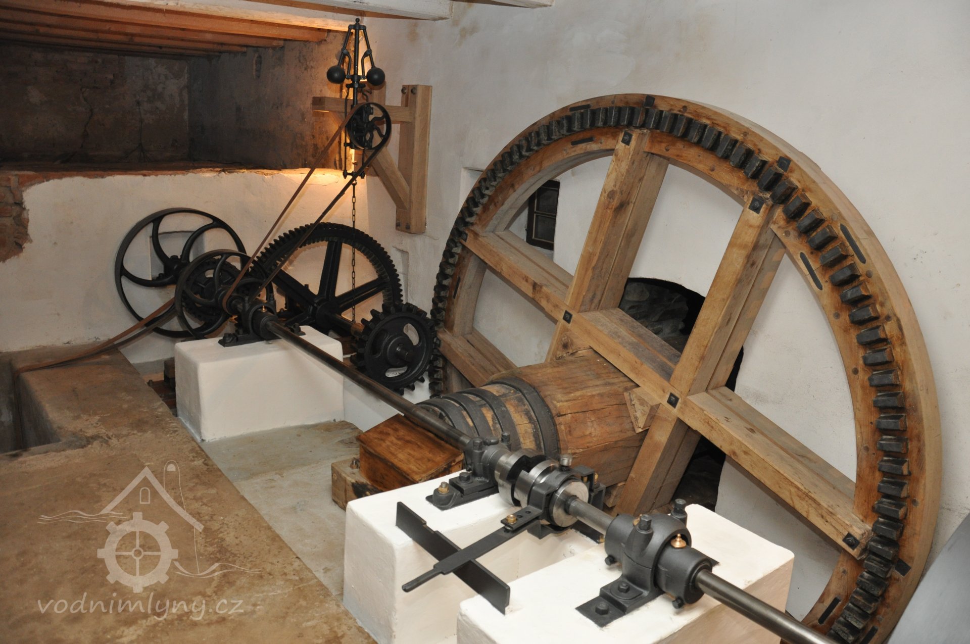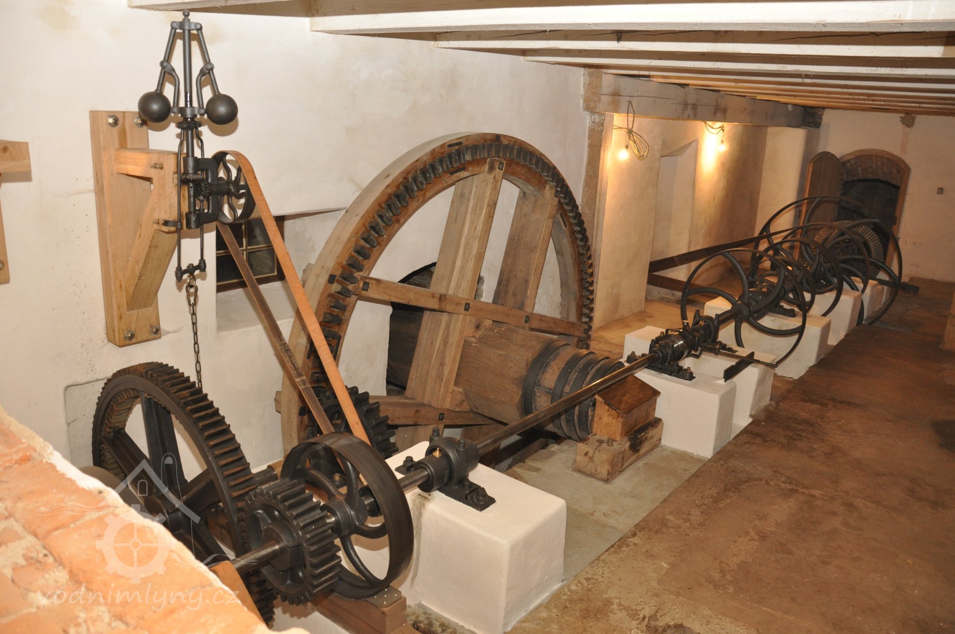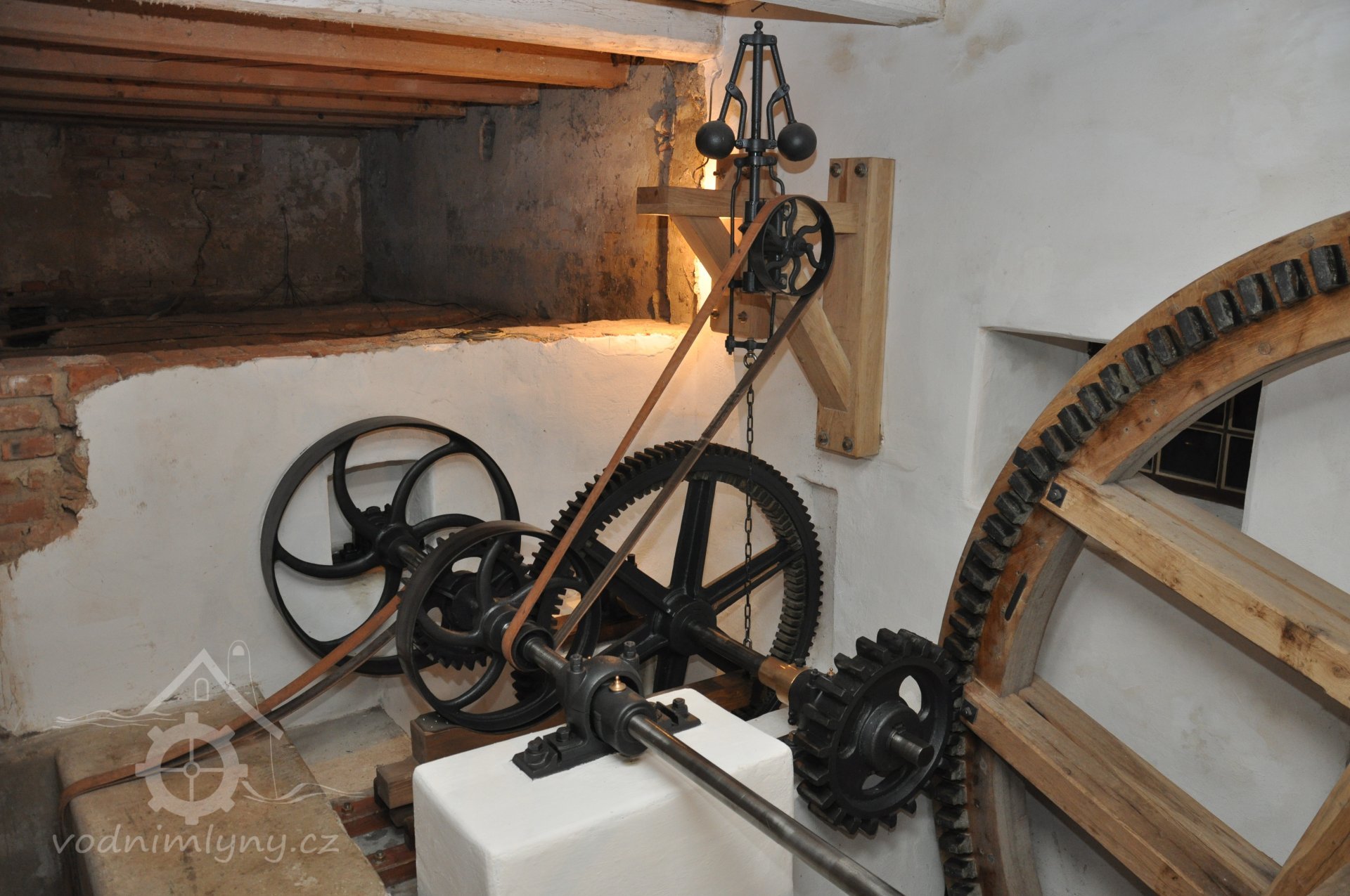 Citlivě zrenovovaná převodová výstroj (paleční soukolí boční a čelní předlohové, hlavní transmise s řemenicemi a kluznými kroužkomaznými ložisky Sellersova typu, zubová posuvná spojka, Wattův kulový odstředivý regulátor s třecí brzdou k pojistnému brzdění transmise při překročení kritických otáček)., 8.9. 2017, © David Veverka - restaurátor strojů, (Prvky na obrázku: transmise, řemenice, převody, transmise, řemenice, převody - paleční kola, pastorky a cévníky (řemeslný výrobek), transmise, řemenice, převody - ozubená kola, pastorky (průmyslový výrobek), transmise, řemenice, převody - transmisní hřídele s řemenicemi (výrobek průmyslový i řemeslný))