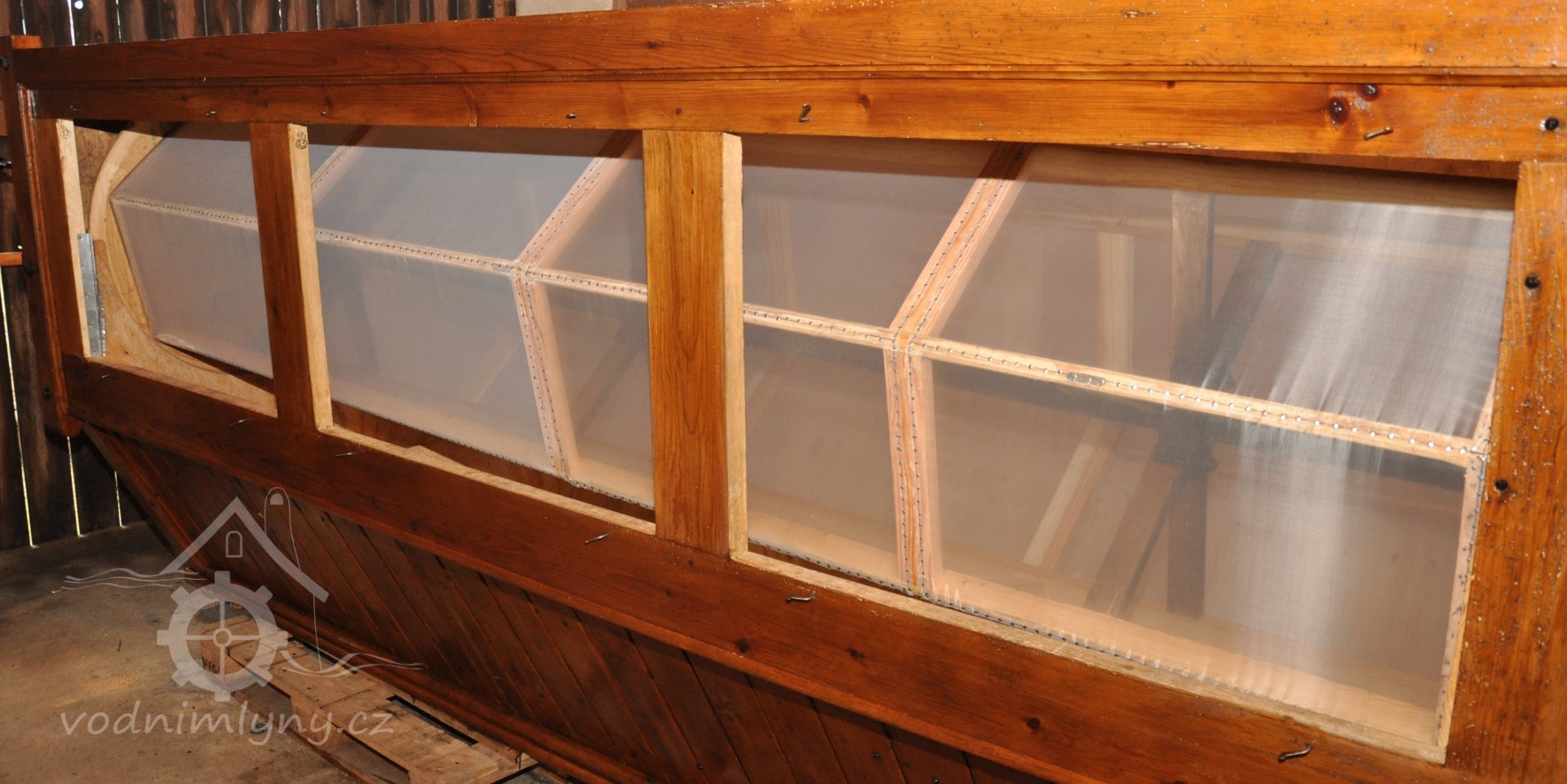 hranolový vysévač moučný od výrobce Hans Wicha - Krnov, detail osazených sít, 2018, © David Veverka - restaurátor strojů, (Prvky na obrázku: vysévač hranolový)