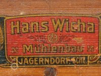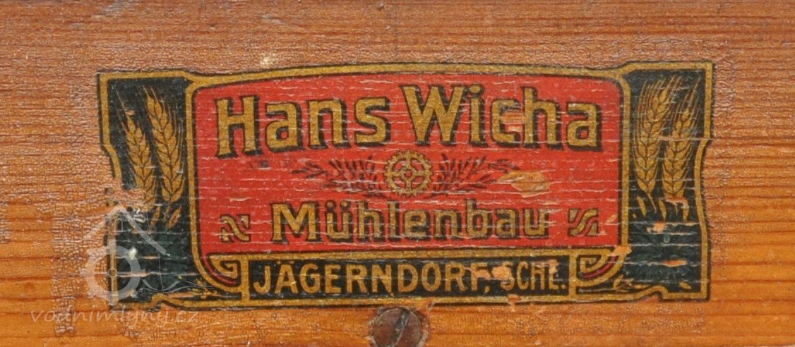 vzácný hranolový předvysévač od výrobce Hans Wicha - Krnov, detail značky výrobce, 2018, © David Veverka - restaurátor strojů, (Prvky na obrázku: vysévač hranolový, značka výrobce na technologickém vybavení)