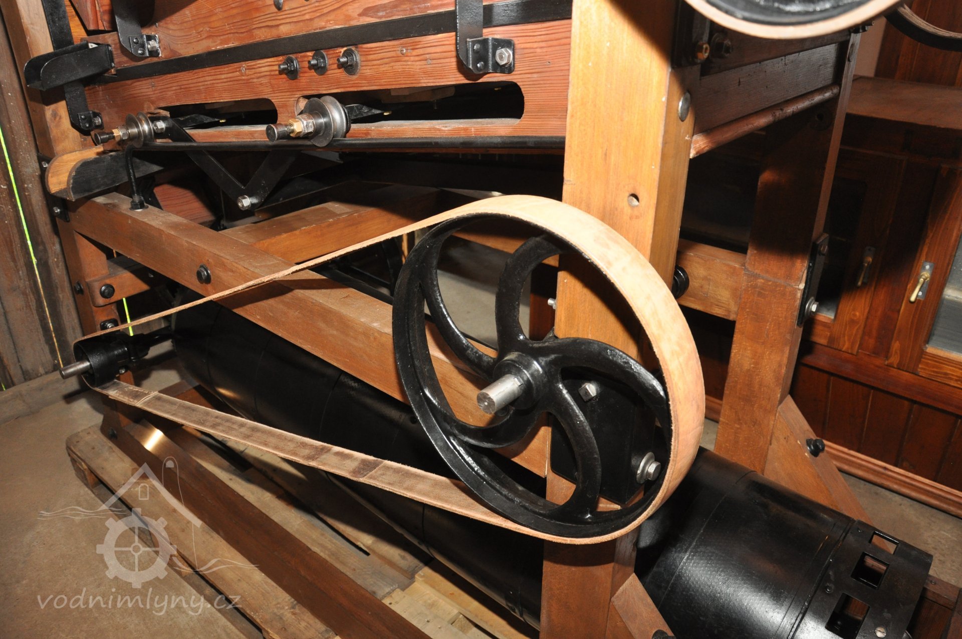 Čistírenský stroj (aspiratér se žejbry, magnet a triér - koukolník) z poč. 20. let 20. stol. Aspiratér s žejbry je výrobkem továrny na mlýnské stroje FERDINAND TESAŘÍK - KŘIŽANOVICE U SLAVKOVA a koukolník vyroben továrnou KALKER TRIEURFABRIK UND FABRIK GELOCHTER BLECHE, MAYER UND CIE. AKTIEN GESELLSCHAFT, HEUMAR BEZIRK KÖLN. Detail mechanismu s excentrem a vodícími kladkami na ometání čistírenského síta v žejbru pomocí speciálních kartáčů., 2019, © David Veverka - restaurátor strojů, (Prvky na obrázku: koukolník, magnet, aspiratér)