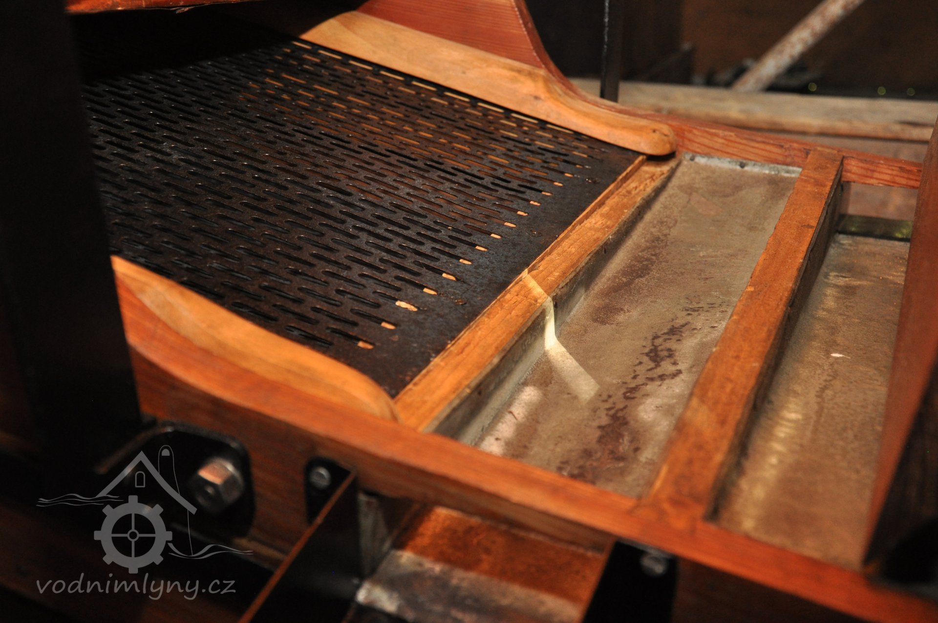 čistírenský stroj (aspiratér se žejbry, magnet a triér - koukolník) z poč. 20. let 20. stol. Aspiratér s žejbry je výrobkem továrny na mlýnské stroje FERDINAND TESAŘÍK - KŘIŽANOVICE U SLAVKOVA a koukolník vyroben továrnou KALKER TRIEURFABRIK UND FABRIK GELOCHTER BLECHE, MAYER UND CIE. AKTIEN GESELLSCHAFT, HEUMAR BEZIRK KÖLN. Detail čistírenského síta a přepadu na žejbru., 2019, © David Veverka - restaurátor strojů, (Prvky na obrázku: aspiratér)
